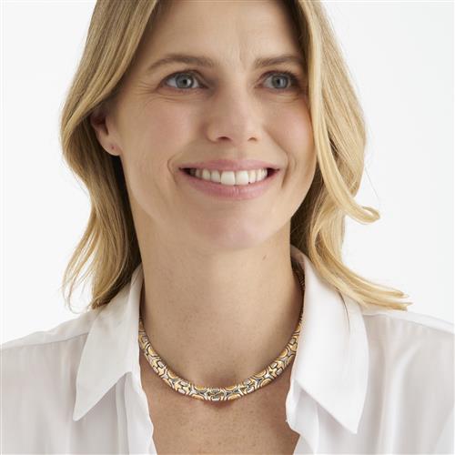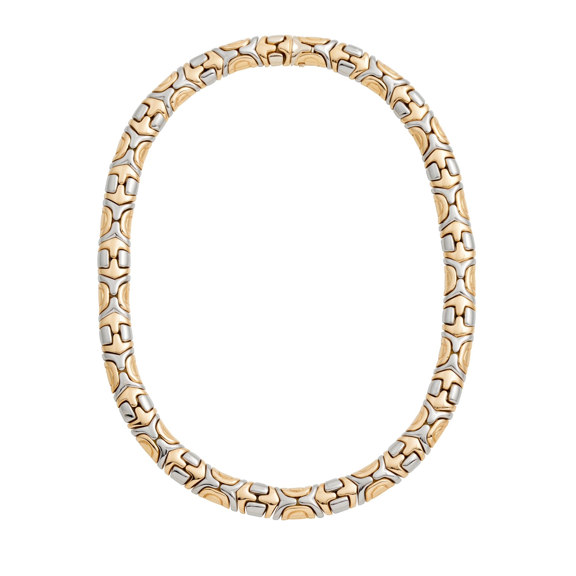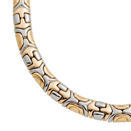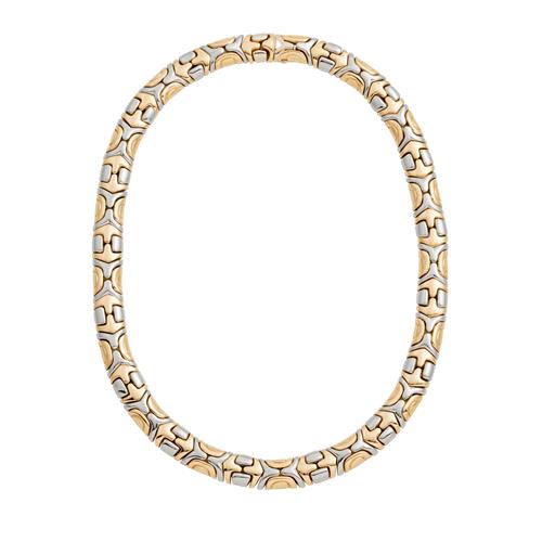 The articulated collier combines two contrasting metals in retrospective style mosaic fancy links, completed by a concealed tongue and groove clasp, signed BVLGARI , length 410mm, gross weight approxiamtely 90 grams.
