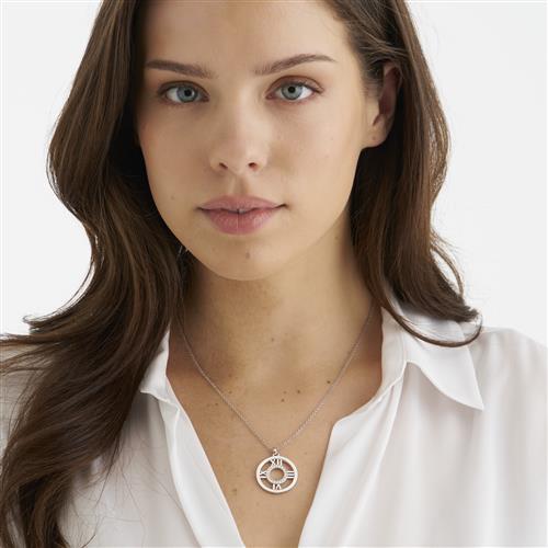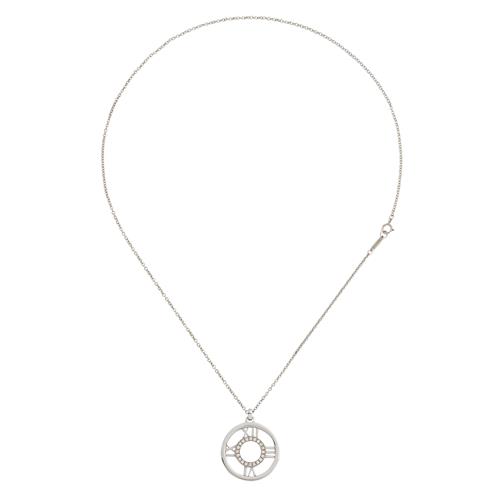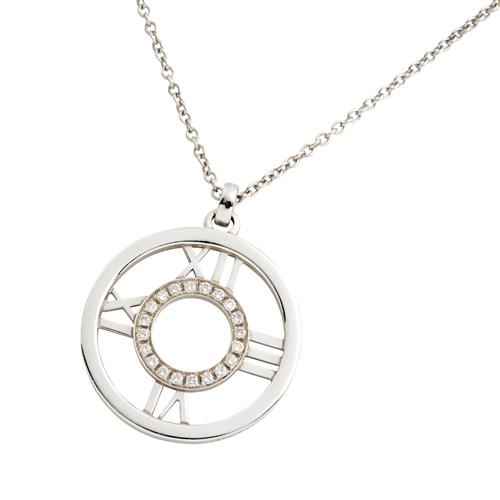 Modelled as an open disc centring a ring of round brilliant-cut diamonds within an openwork surround with Roman numeral motifs, suspended from a cable link chain completed by a bolt ring clasp, signed Tiffany & Co., length 460mm gross weight approximately 9.8 grams.