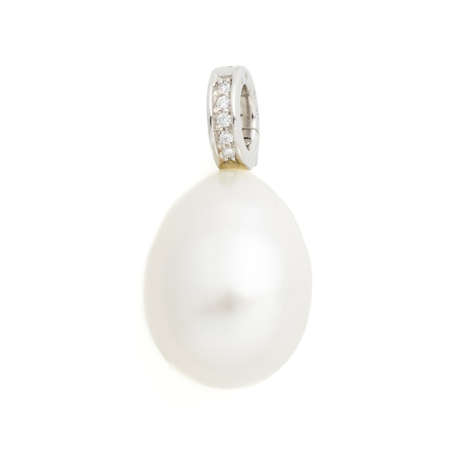 A SOUTH SEA PEARL AND DIAMOND ENHANCER IN 9CT WHITE GOLD, THE PEARL MEASURING 12 X 15.3MM