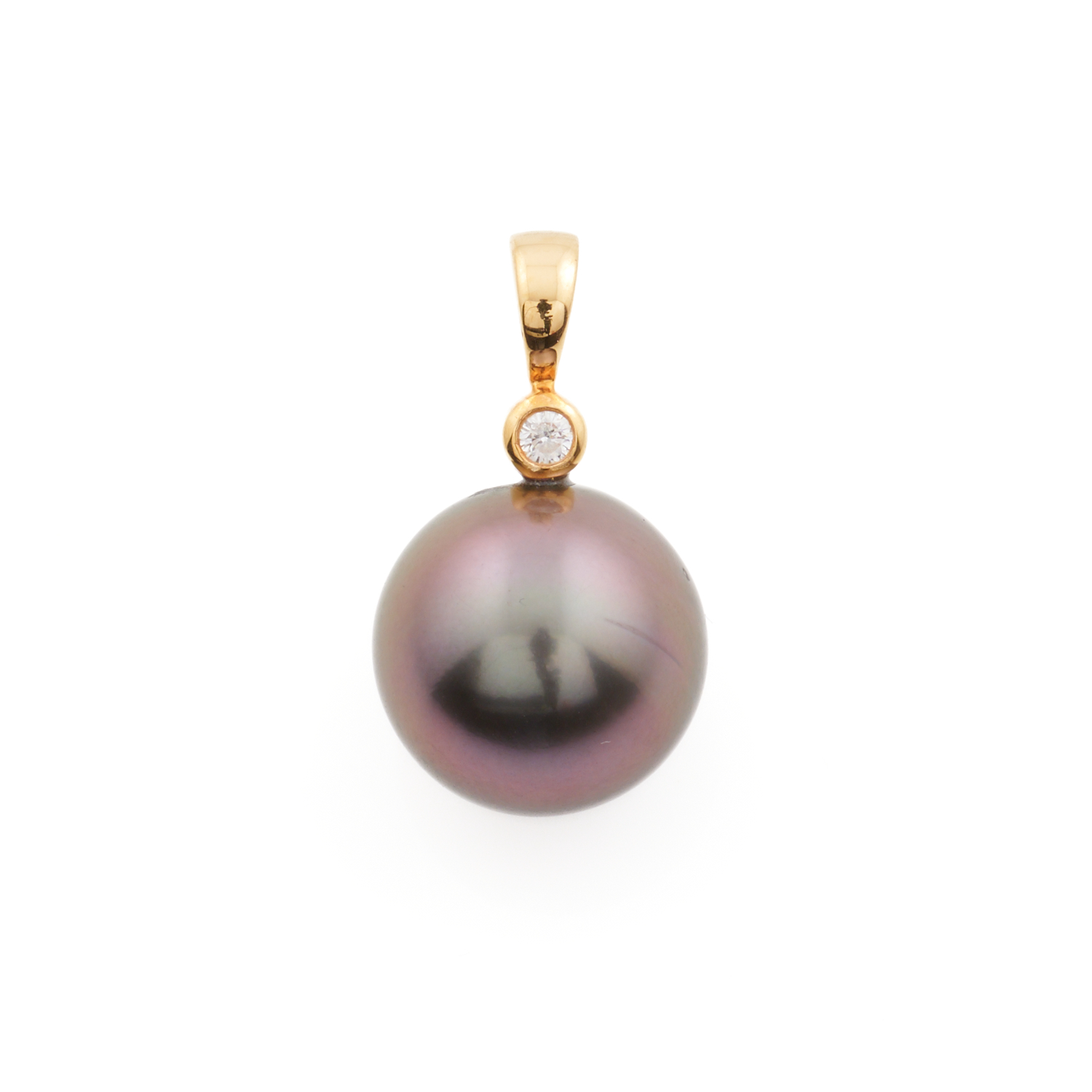 A TAHITIAN PEARL AND DIAMOND PENDANT IN 18CT GOLD, THE PEARL MEASURING 12MM