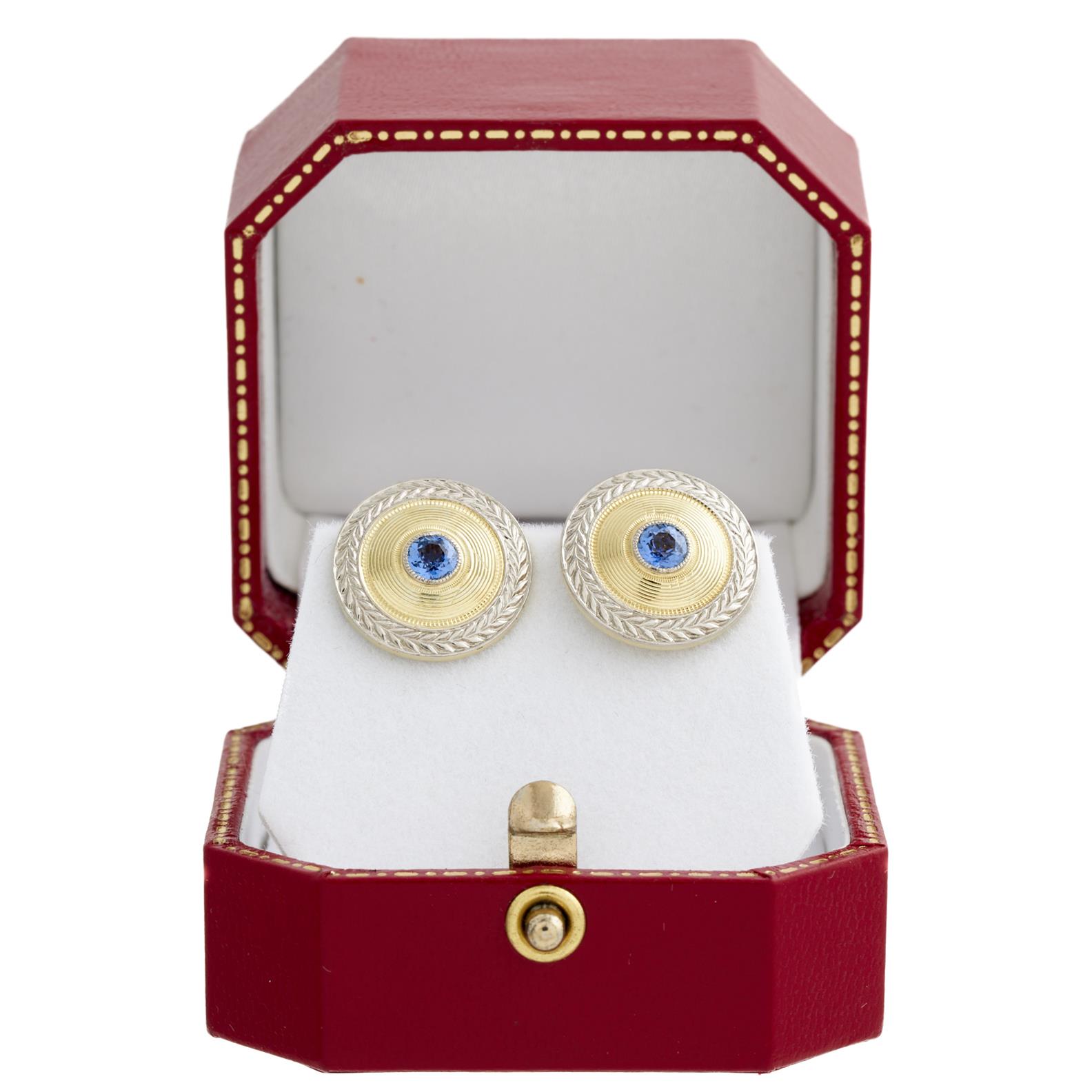 A PAIR OF CEYLON SAPPHIRE STUD EARRINGS IN TWO-TONE 14CT GOLD AND PLATINUM, THE SAPPHIRES TOTALLING 0.56CT, TO POST AND BUTTERFLY FITTINGS, 15MM, 5.8GMS, ACCOMPANIED BY A BOX