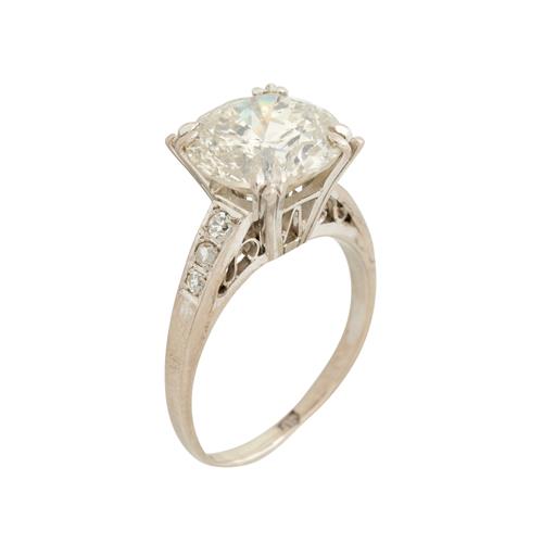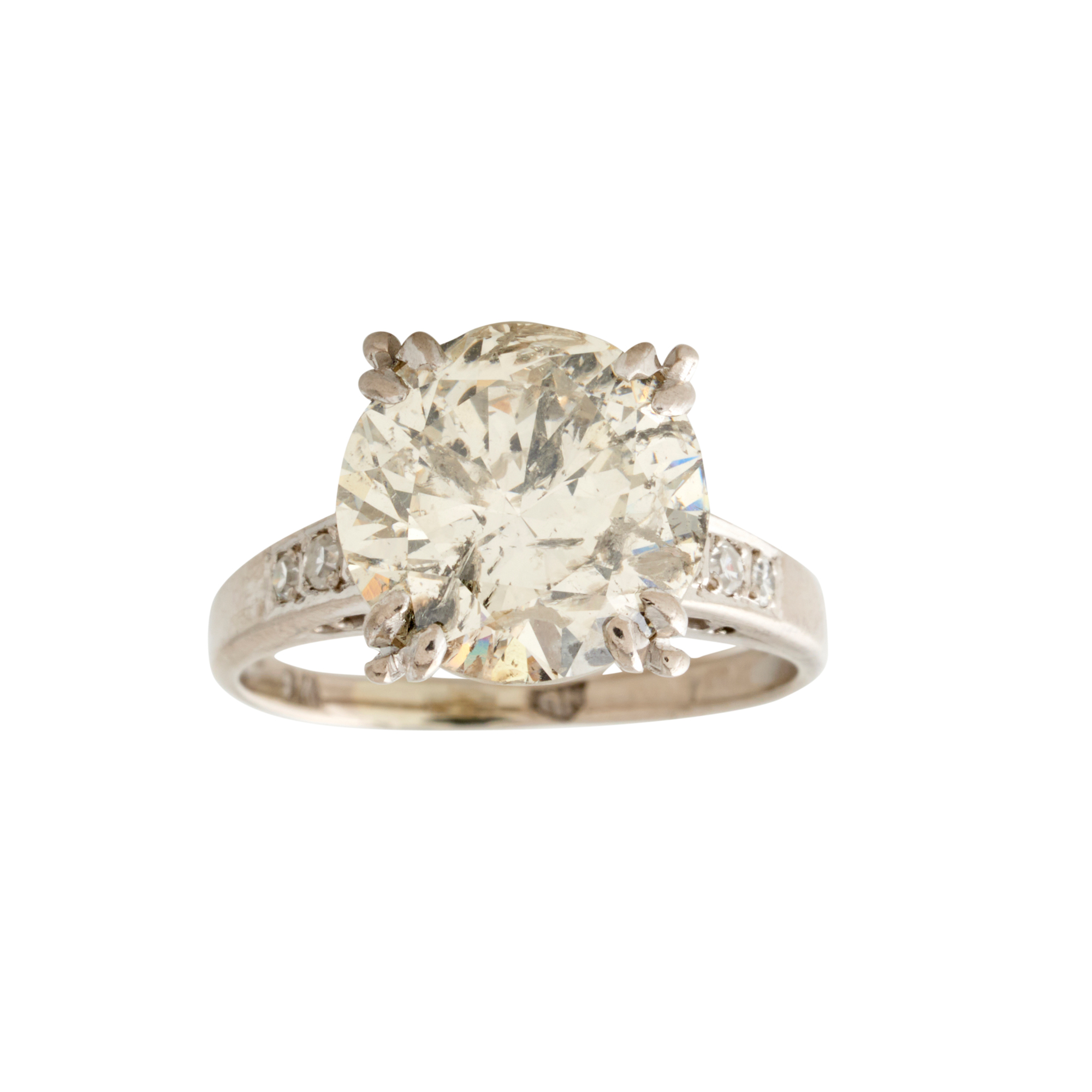 Claw-set with a round brilliant-cut diamond weighing approximately 5.50 carats, to shoulders grain-set with single-cut diamonds together weighing approximately 0.14 carats, size N, gross weight approximately 4.9 grams.