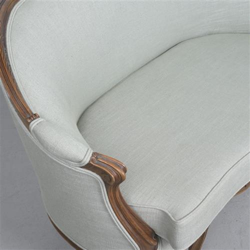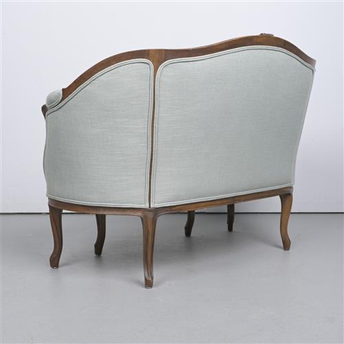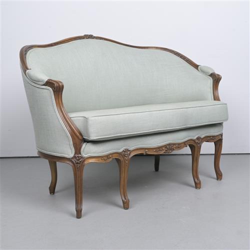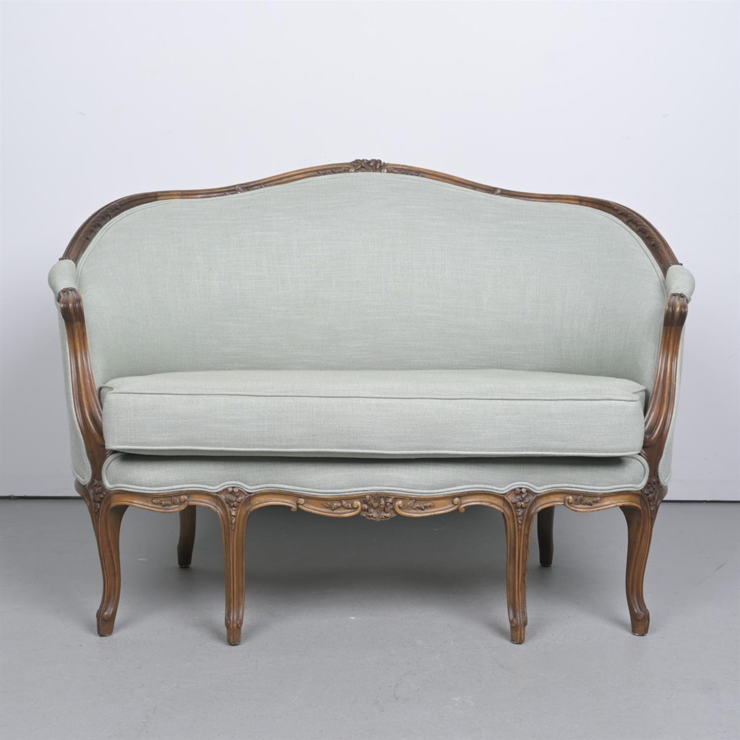 A LATE 19th CENTURY FRENCH WALNUT CANAPE, RECENTLY REUPHOLSTERED IN A LINEN BLEND FABRIC ( 93H X 133W X 73D CM)