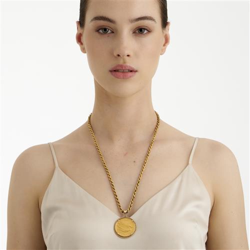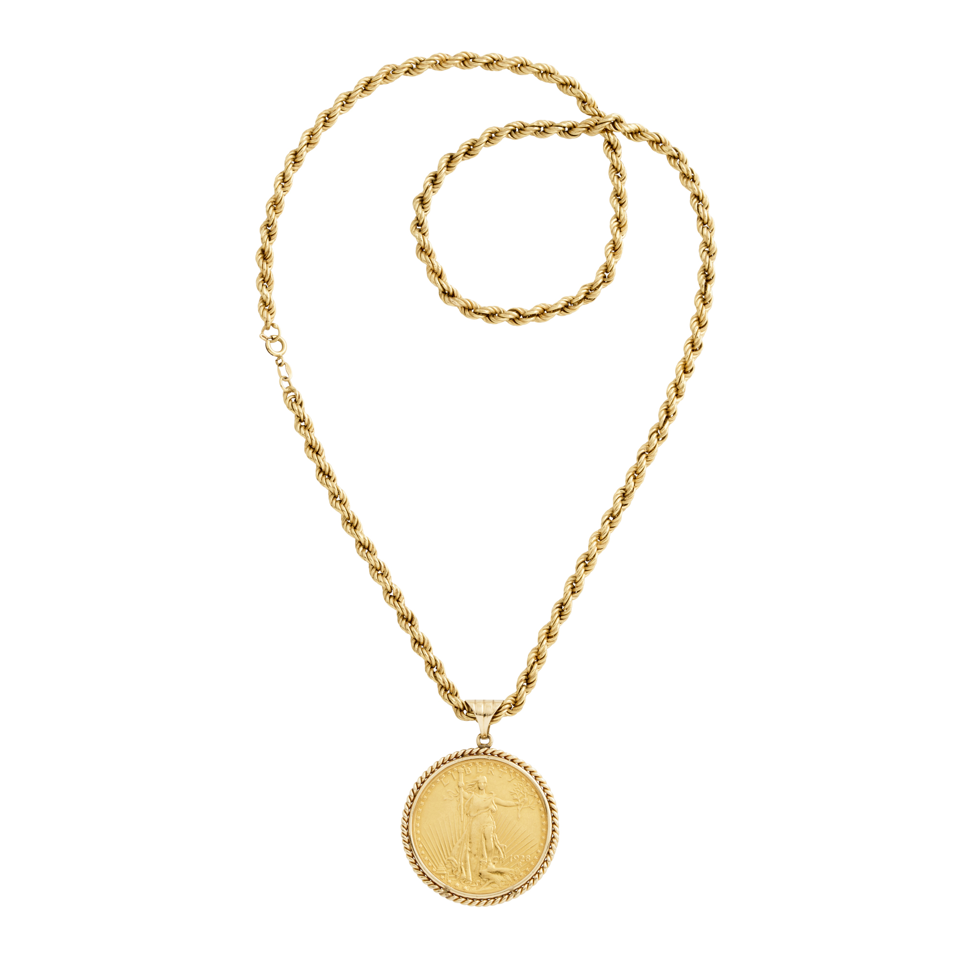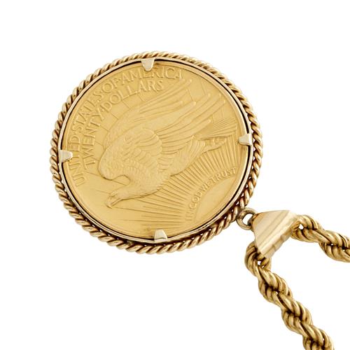 Centring a framed United States of America twenty dollar coin, suspended from a ropetwist chain completed by a bolt ring clasp, pendant diameter 36mm, necklace length 620mm, gross weight approximately 57.4 grams.