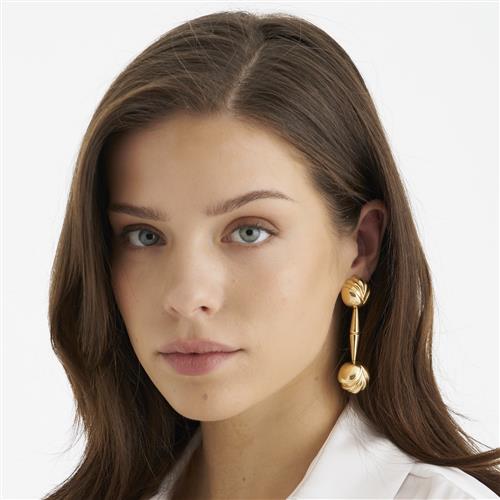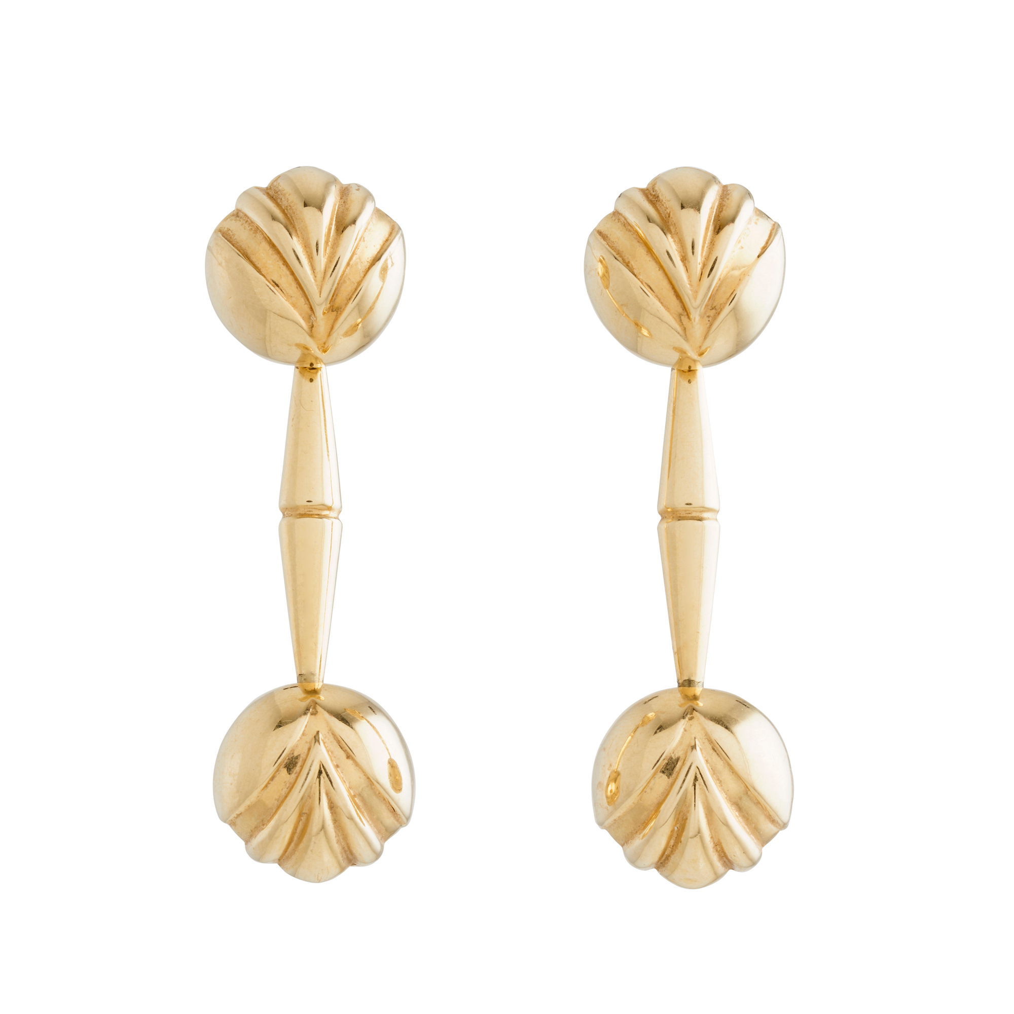 Composed of a fluted sphere surmount suspending a gold drop terminating in a fluted ball, to post and clip fittings, length 60mm, gross weight approximately 17.0 grams.