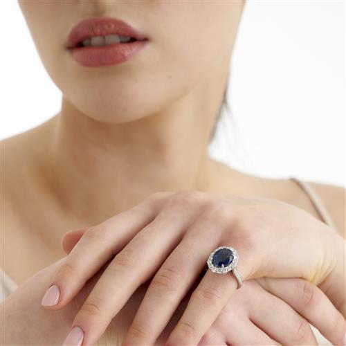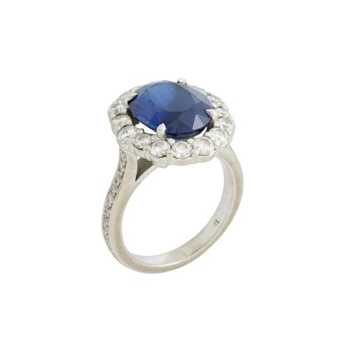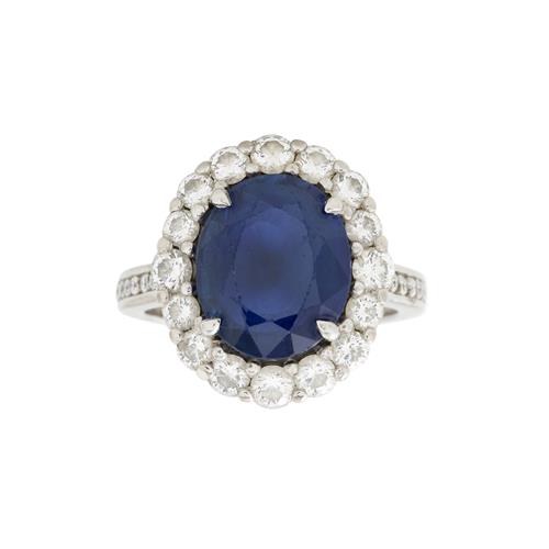 Of cluster design, centring a claw-set oval cut-sapphire weighing 5.48 carats, within a surround of claw set round brilliant-cut diamonds to shoulders grain-set with further round brilliant-cut diamonds, the diamonds together weighing approximately 1.09 carats, size J 1/2, gross weight approximately 8.2 grams.