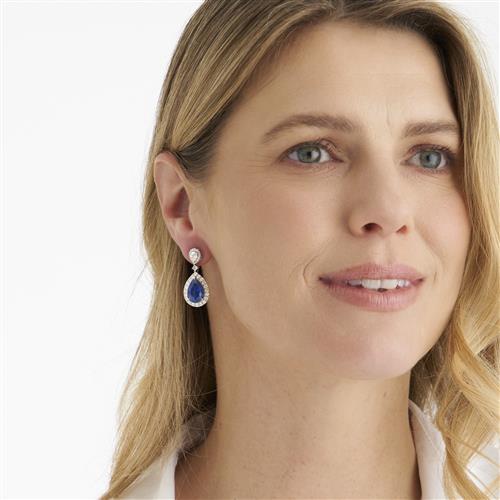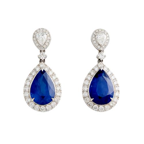 Each earring comprising a claw-set pear-cut sapphire weighing 5.71 carats and 5.50 carats respectively and of vivid blue hue, within a surround of claw-set brilliant-cut diamonds, suspended below a claw-set solitaire diamond, to a pear-cut diamond cluster surmount, the diamonds together weighing approximately 1.20 carats, to post and butterfly fittings, length 32mm, gross weight approximately 10.8 grams.