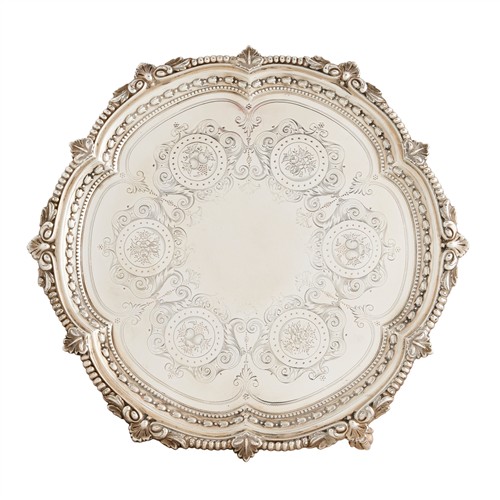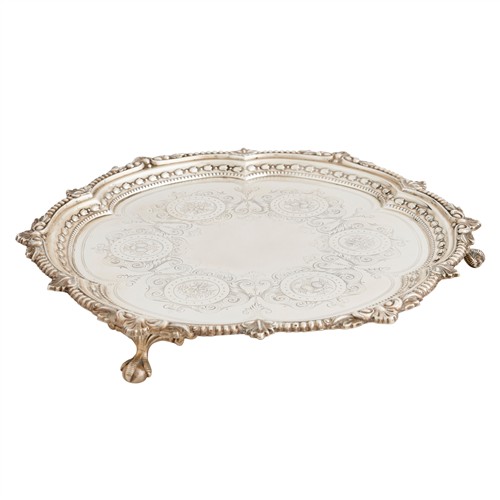 Of shaped circular outline, the centre engraved with foliate designs, the moulded edge with beaded and husk borders and foliate points to the beaded rim, on ball and claw feet