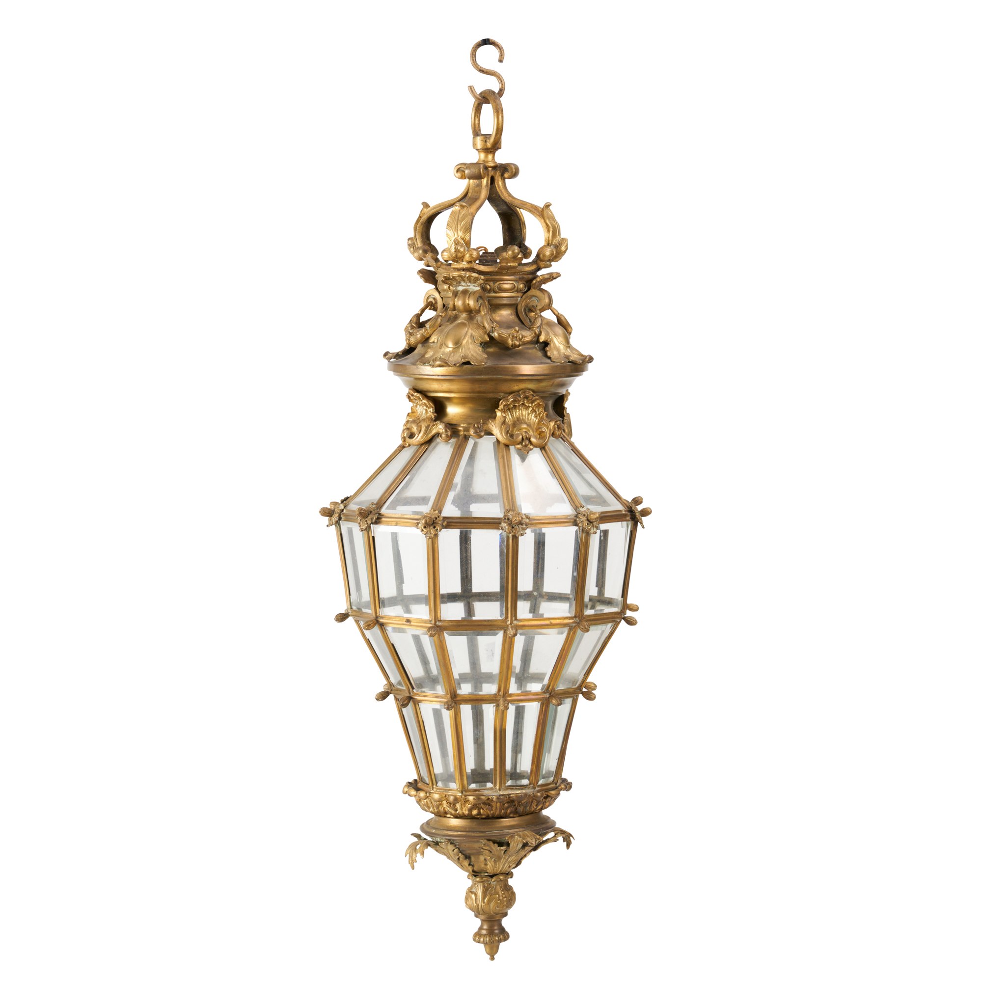 After the design of the eighteenth century lanterns installed at the Palace of Versailles, the tiered and facetted glazing of bevelled panes surmounted with a crown and various Classical motifs and mounted with a foliate base below, with old light fittings to the interior of the top and base