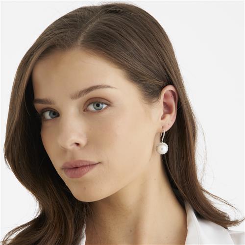 Featuring a pair semi-round pearls measuring 12.5m, within a surround of scallop-set round brilliant-cut diamonds, suspended below a diamond drop, to shepherd hook fittings, length 31mm, gross weight approximately 9.8 grams.
