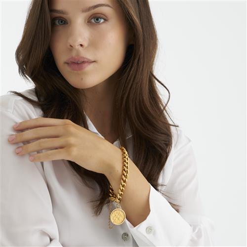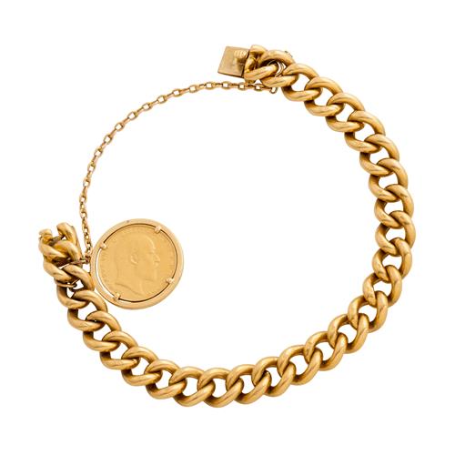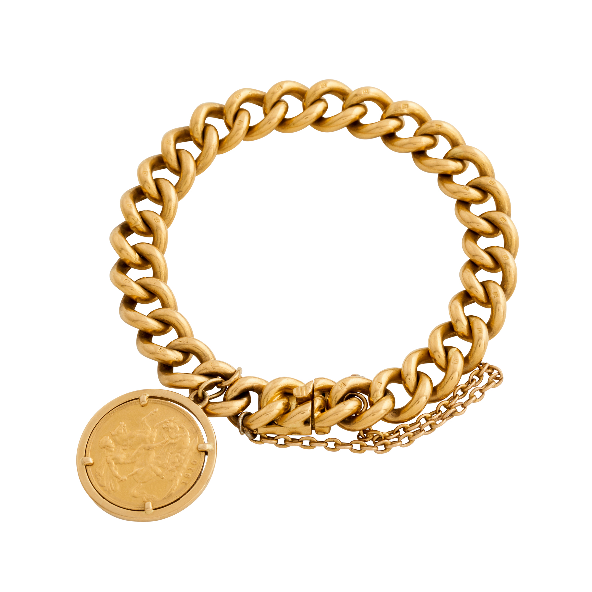Modelled as a series of curblinks suspending a framed 1910 sovereign, completed by a concealed box clasp, length 200mm, gross weight approximately 106.3 grams.