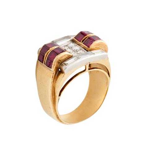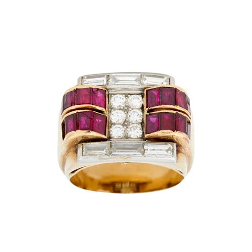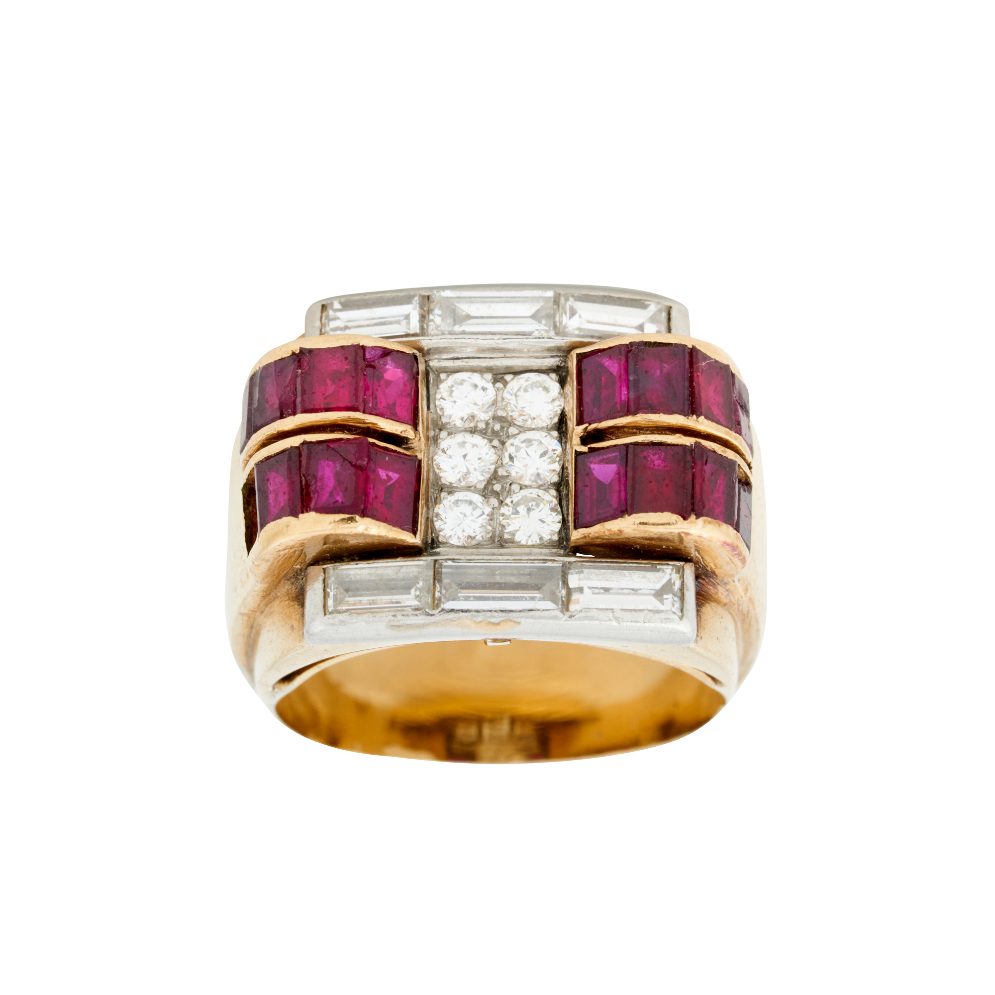 Of retro design, centring a panel of brilliant-cut diamonds flanked by convex scroll panels detailed within invisible-set baguette-cut rubies, framed by rows of invisible-set baguette-cut diamonds, size M, gross weight approximately 14.2 grams.