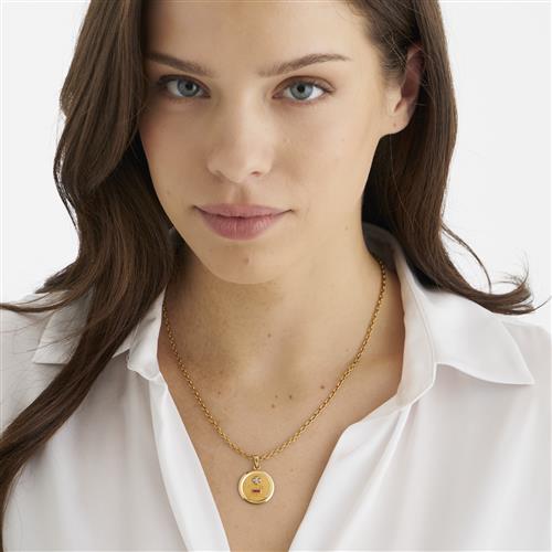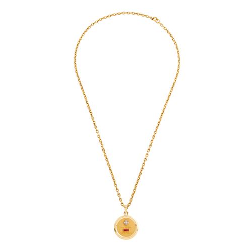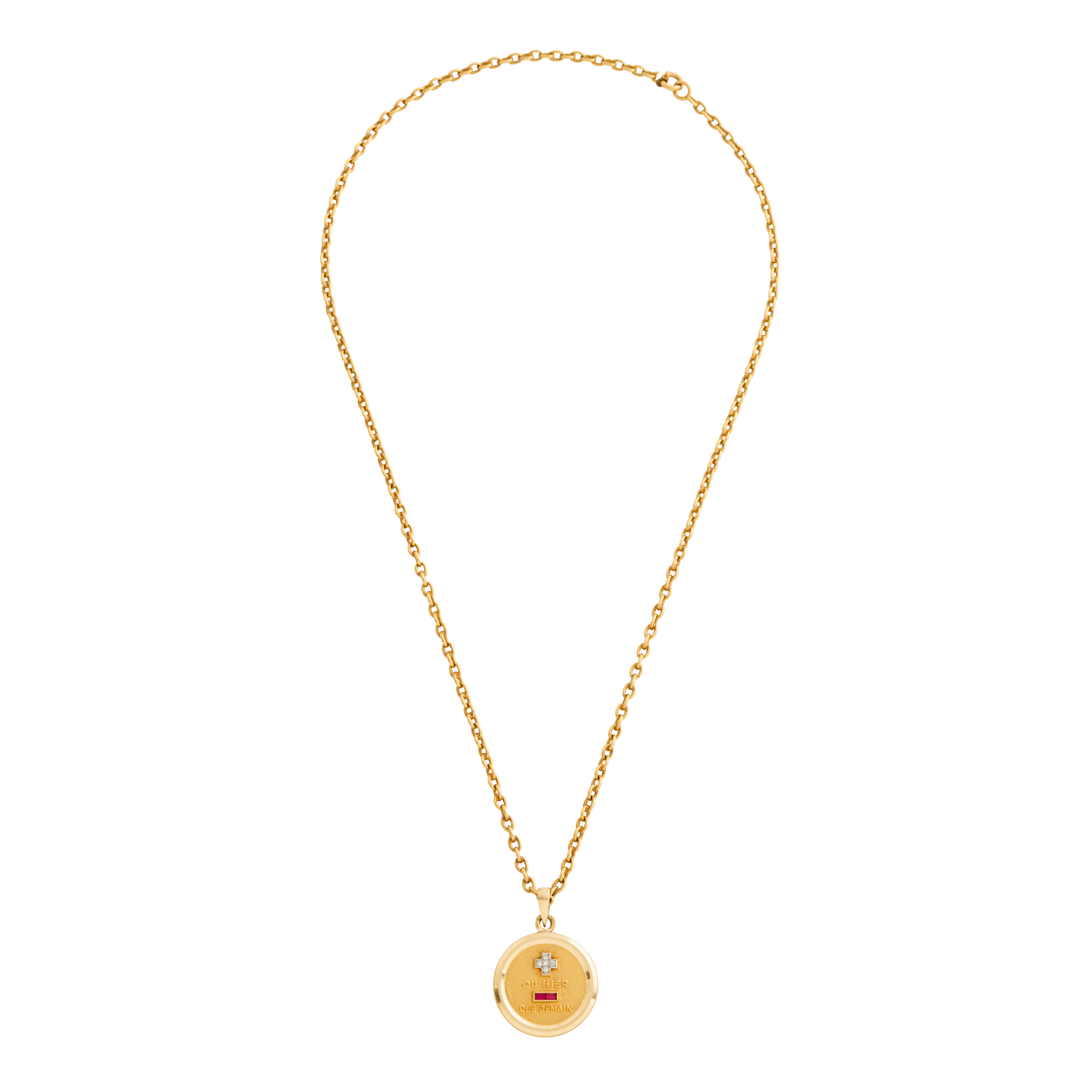 Modelled as a medallion inscribed "+ Qu'hier - Que Demain", detailed with rose-cut diamonds and baguette-cut rubies, suspended from a cable link chain, pendant diameter 18mm, chain length 560mm, French assay marks, gross weight approximately 13.2 grams.