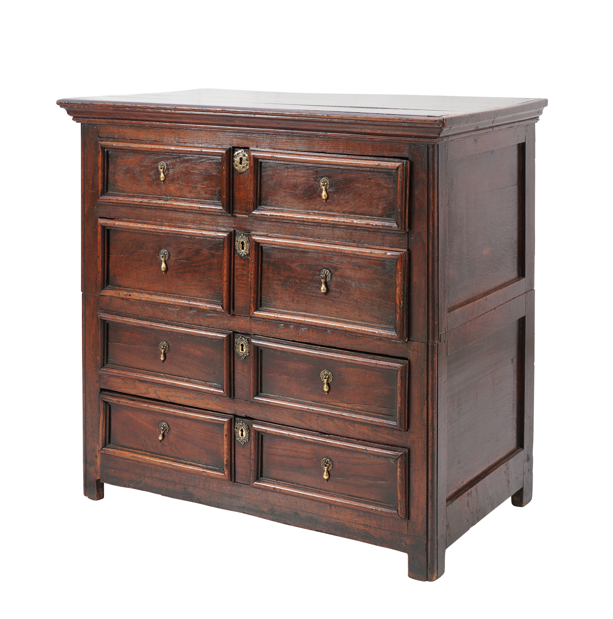 There are narrow shrinkage gaps and variations in the levels between the boards to the top; small gaps between some mouldings and the carcase; various small losses to the lip mouldings to the edges of the drawer fronts and elsewhere; minor knocks and cracks scattered throughout; and old (long since inactive) worm holes to the pine backboards.
