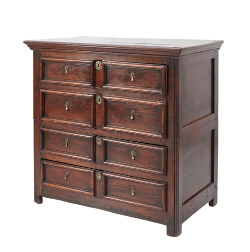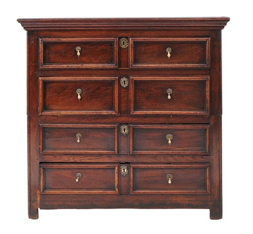 In two parts, the moulded cornice above four long drawers each with a moulded front of two panels, on stile feet