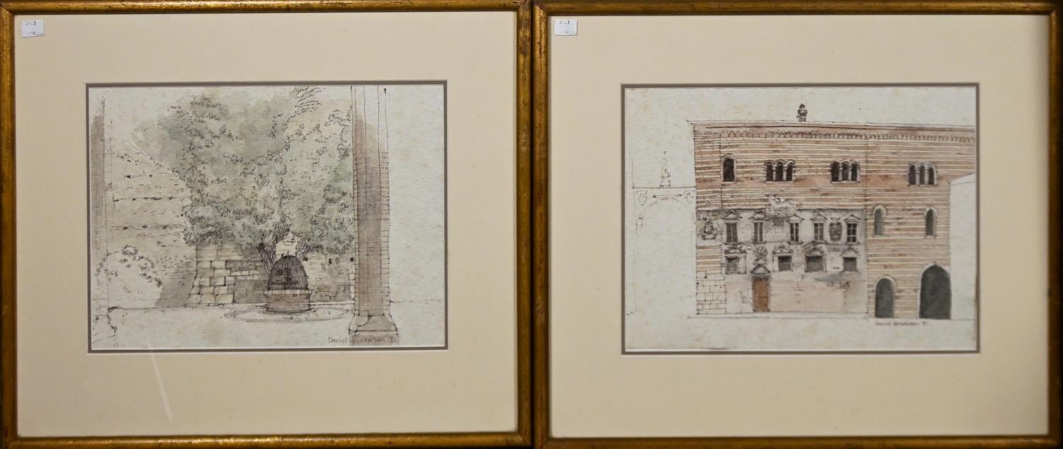 INK AND WASH ON PAPER (BOTH), SIGNED AND DATED LOWER RIGHT (BOTH), 26.5 X 36.5CM (EACH), FRAME SIZE: 46.5 X 55CM (EACH)