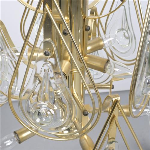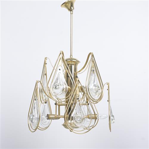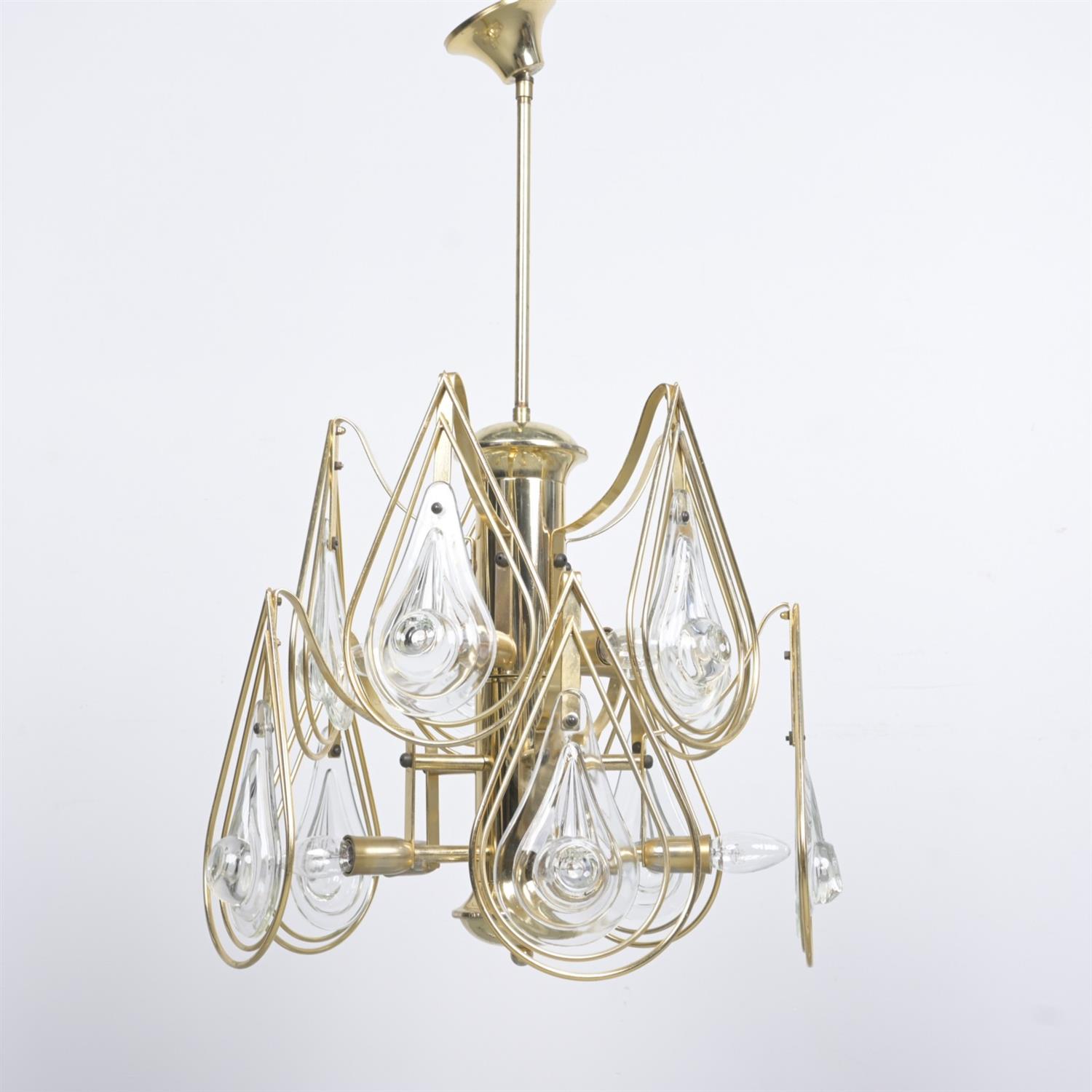 A 1970s ITALIAN TEN-LIGHT BRASS CHANDELIER, WITH GLASS DIFFUSERS (110CM H X 54CM W)