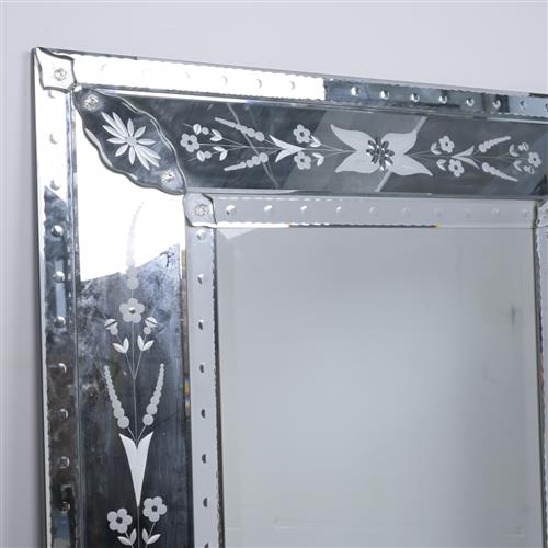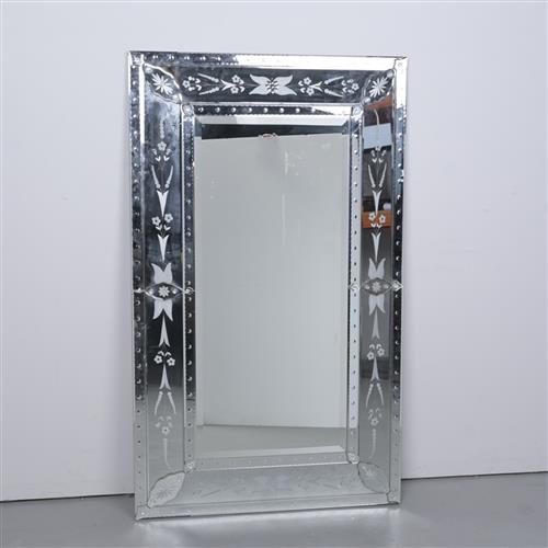 A LARGE VENETIAN CUSHION-FRONT MIRROR, WITH ETCHED DECORATION TO THE MARGINAL PLATES (152CM H X 91CM W)