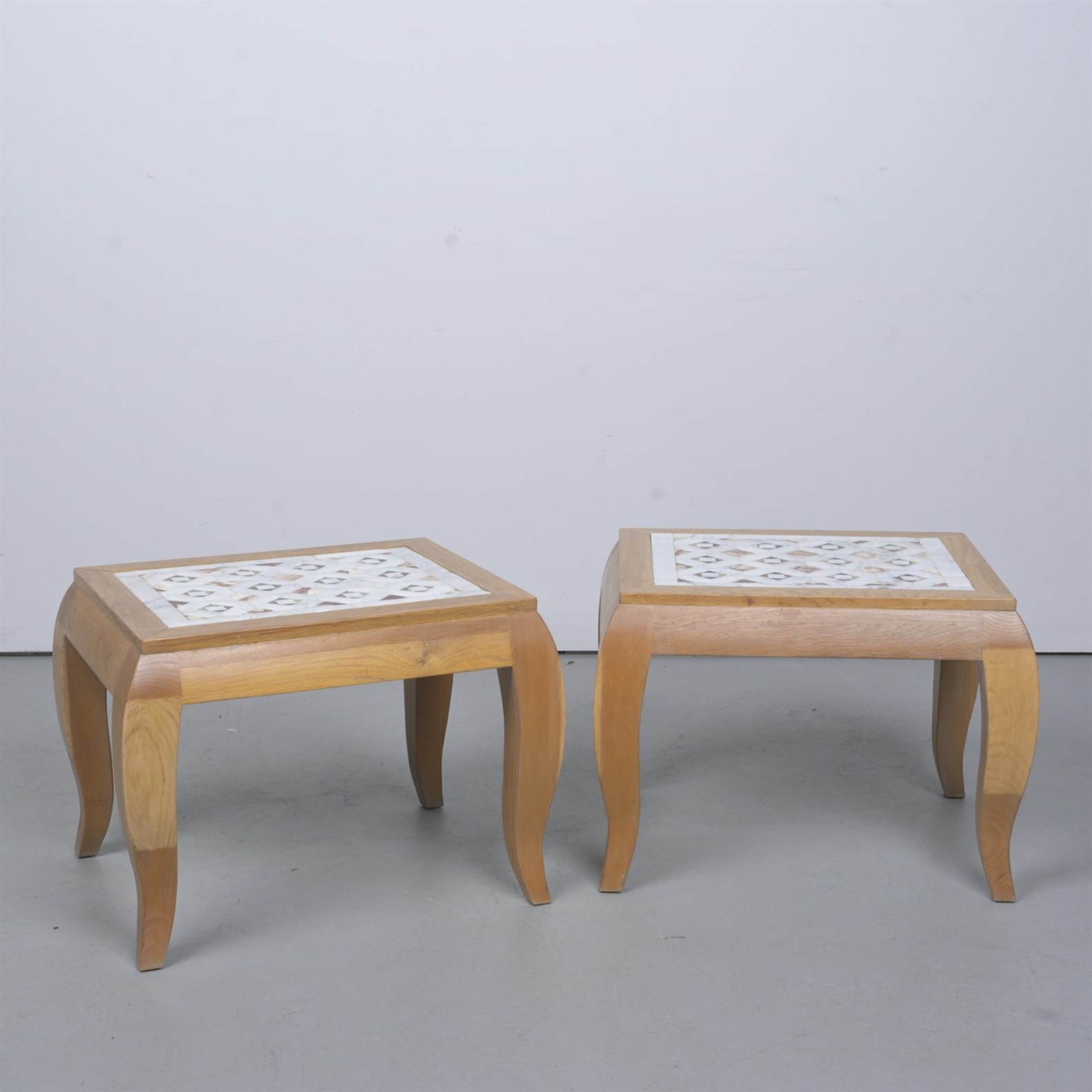 A PAIR OF MARBLE INLAID OCCASIONAL TABLES (49CM H X 63CM W X 51CM D) (THIS ITEM MUST BE REMOVED BY CARRIERS AT THE CUSTOMER'S EXPENSE. LEONARD JOEL STAFF CANNOT ASSIST CARRYING THIS ITEM)