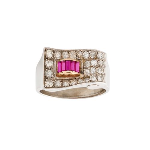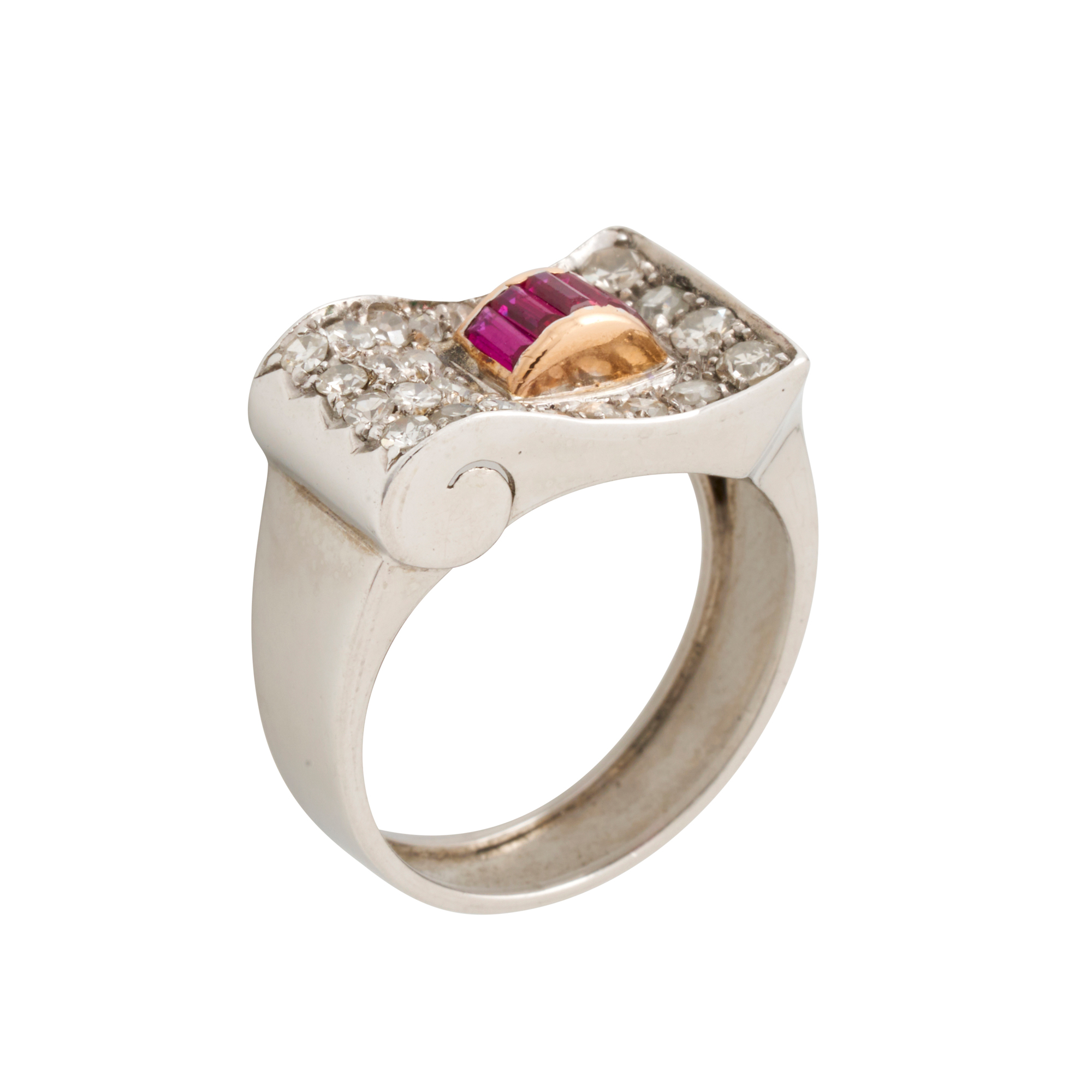 Of retro scroll design, grain-set with single-cut diamonds, with convex baguette cut synthetic ruby feature in gold, size L, gross weight approximately 5.6 grams.