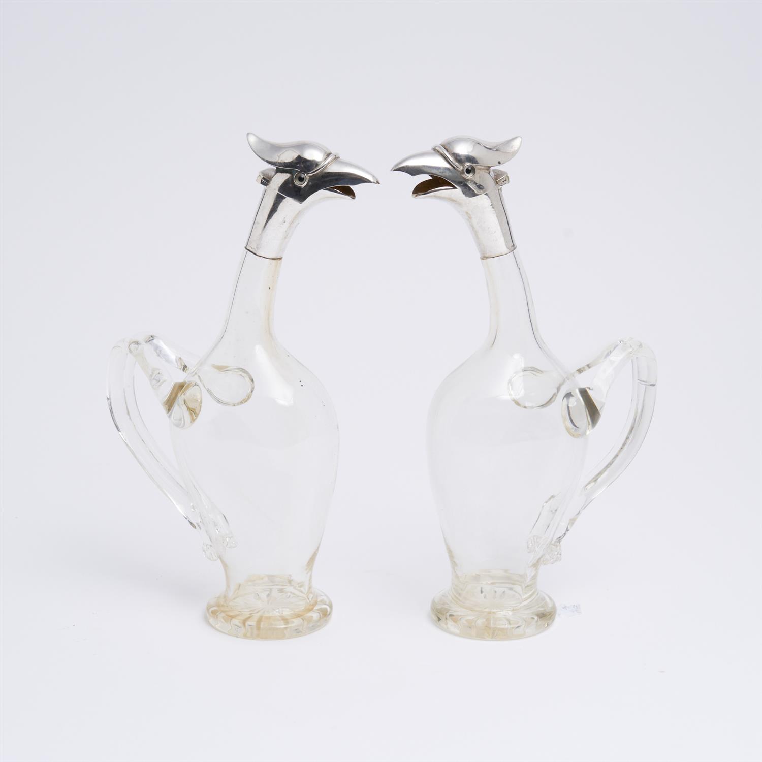 A PAIR OF LATE 19TH CENTURY 800 SILVER MOUNTED AUSTRO HUNGARIAN BIRD FORM CRYSTAL DECANTERS H.26CM