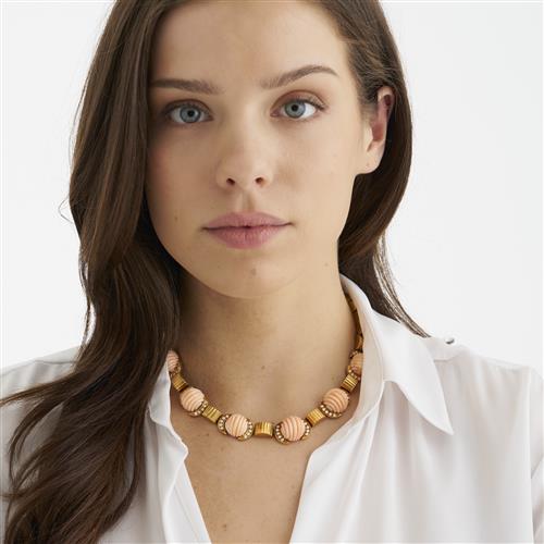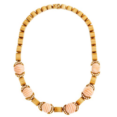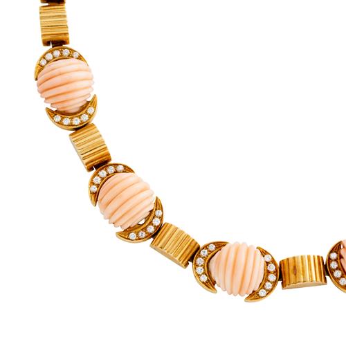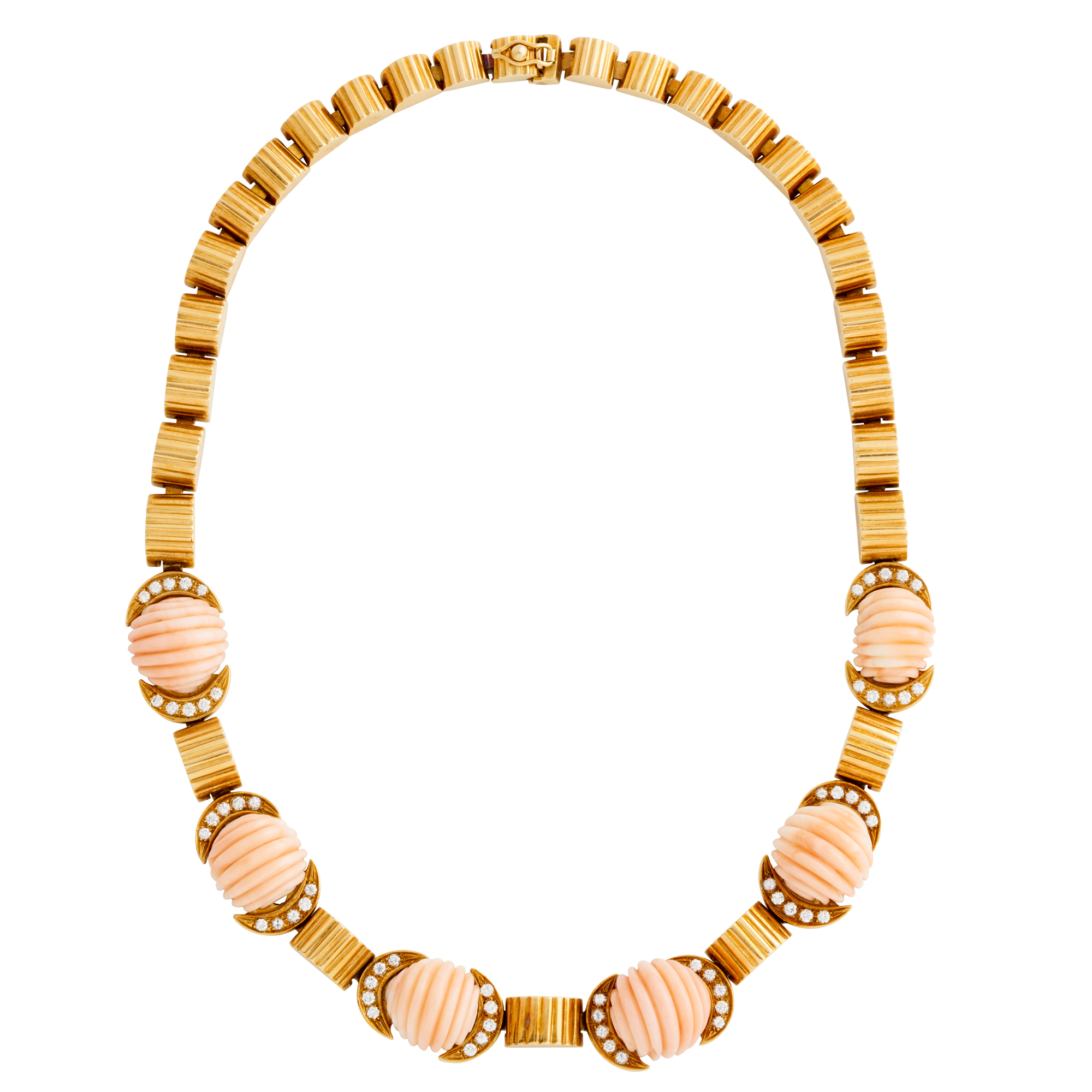 Featuring six carved domed light pink natural coral measuring approximately 11.00 to 14.00mm, each within a crescent setting grain-set round brilliant-cut diamonds, to an articulated necklace of convex fluted links completed by a concealed box clasp, length 405mm, gross weight approximately 123.5 grams.