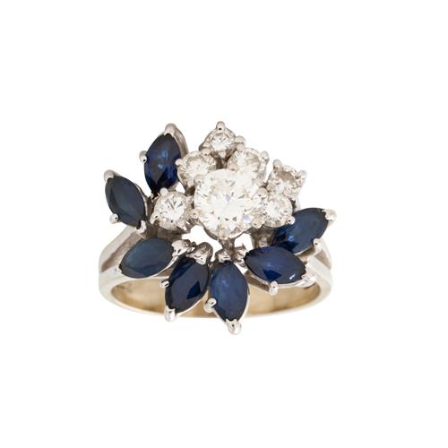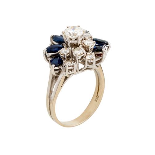 Of cluster design, claw-set with round brilliant-cut diamonds and end-set marquise-cut sapphires, the diamonds together weighing approximately 1.03 carats and the sapphires together weighing approximately 1.50 carats, size K, gross weight approximately 6.2 grams.
