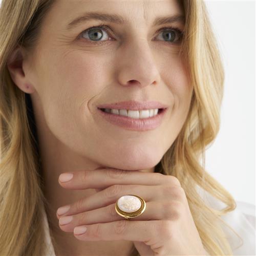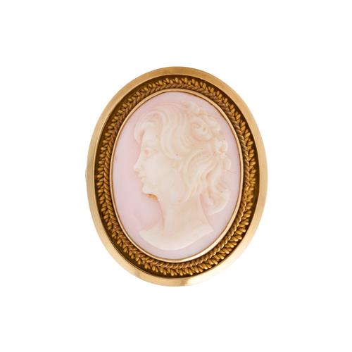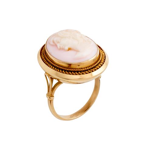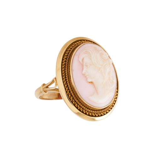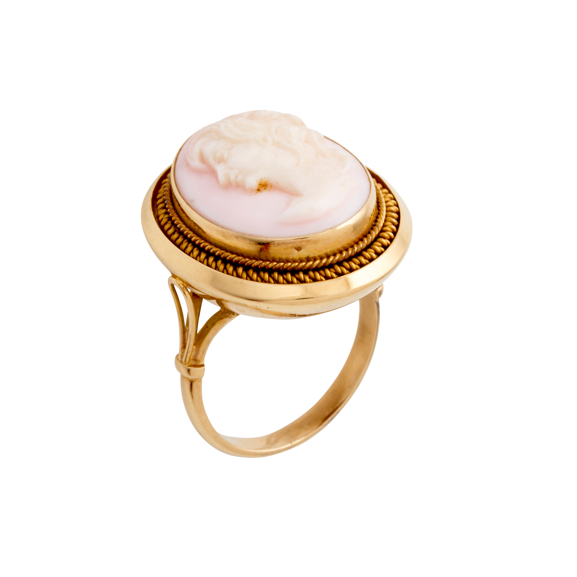 Centring a shell cameo depicting a maiden in profile within a decorative surround, size O, gross weight approximately 9.90 grams.