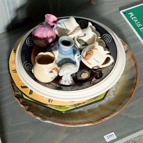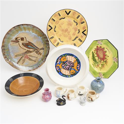 A COLLECTION OF AUSTRALIANA CERAMICS INCLUDING AN INCISED KOOKABURRA PLATTER SIGNED ‘JD' TOGETHER WITH TWO SMALL PLATTERS, TWO DISHES, FIVE ROSE NOBLE MINIATURES AND OTHERS DIA.32CM