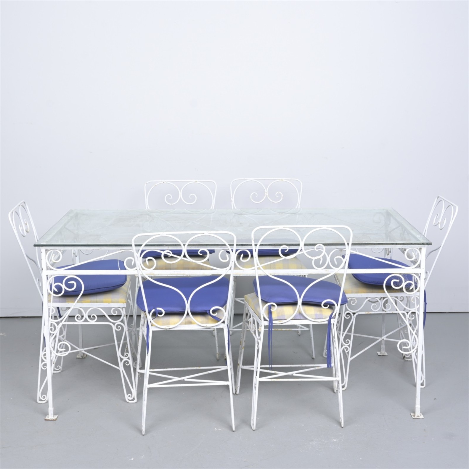 A WROUGHT IRON PATIO DINING SUITE COMPRISING A GLASS-TOPPED TABLE AND SIX CHAIRS WITH LOOSE CUSHIONS ( TABLE MEASURES 80H X 170W X 90D CM) (THIS ITEM MUST BE REMOVED BY CARRIERS AT THE CUSTOMER'S EXPENSE. LEONARD JOEL STAFF CANNOT ASSIST CARRYING THIS ITEM)