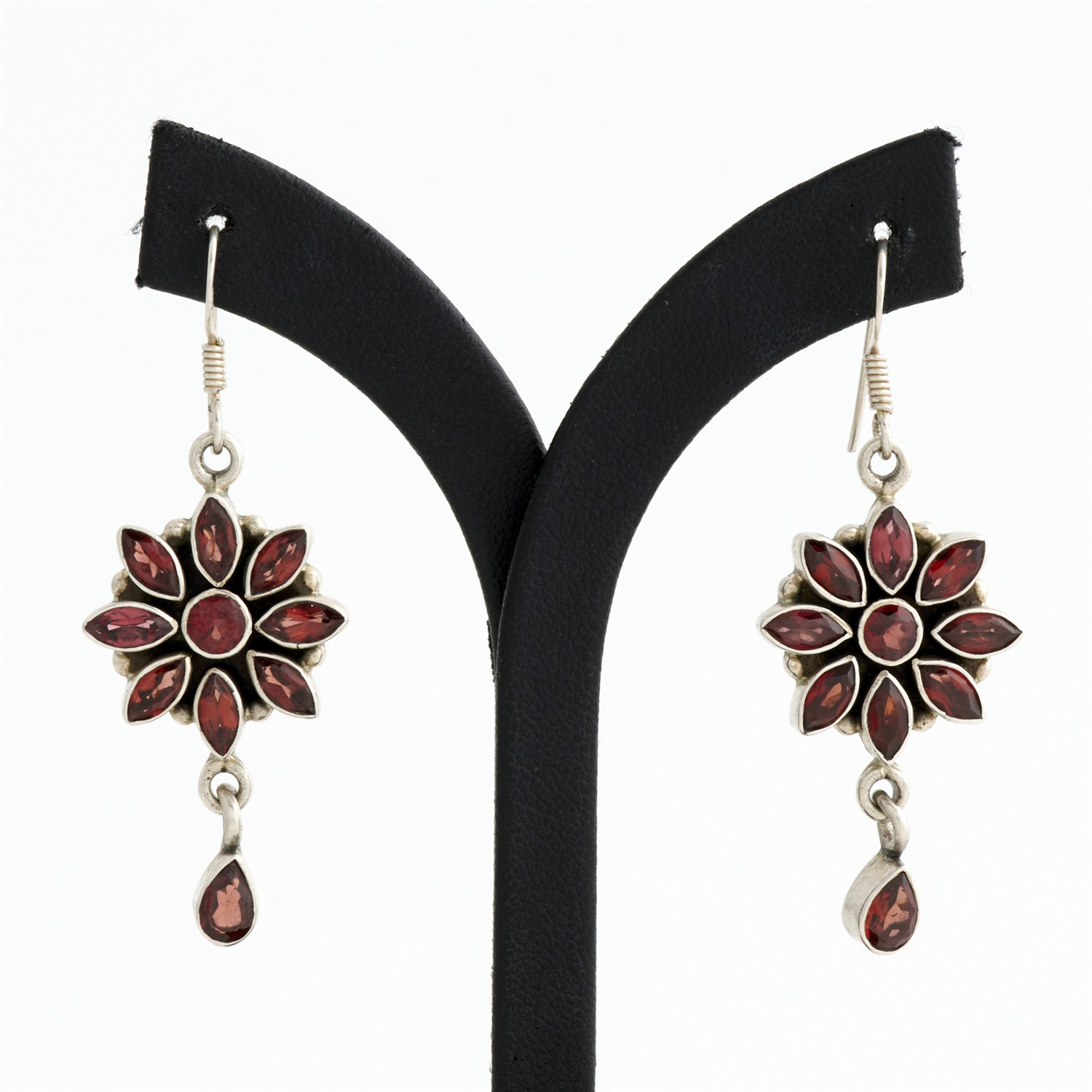 A PAIR OF GARNET EARRINGS IN STERLING SILVER, TO SHEPHERD HOOK FITTINGS, 50MM