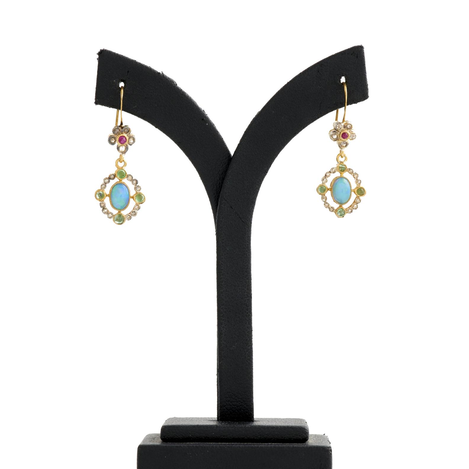 A PAIR OF OPAL, RUBY AND DIAMOND EARRINGS IN SILVER GILT TO SHEPHERD HOOK FITTINGS IN 9CT GOLD, THE OPALS TOTALLING 1.0CTS, 28MM