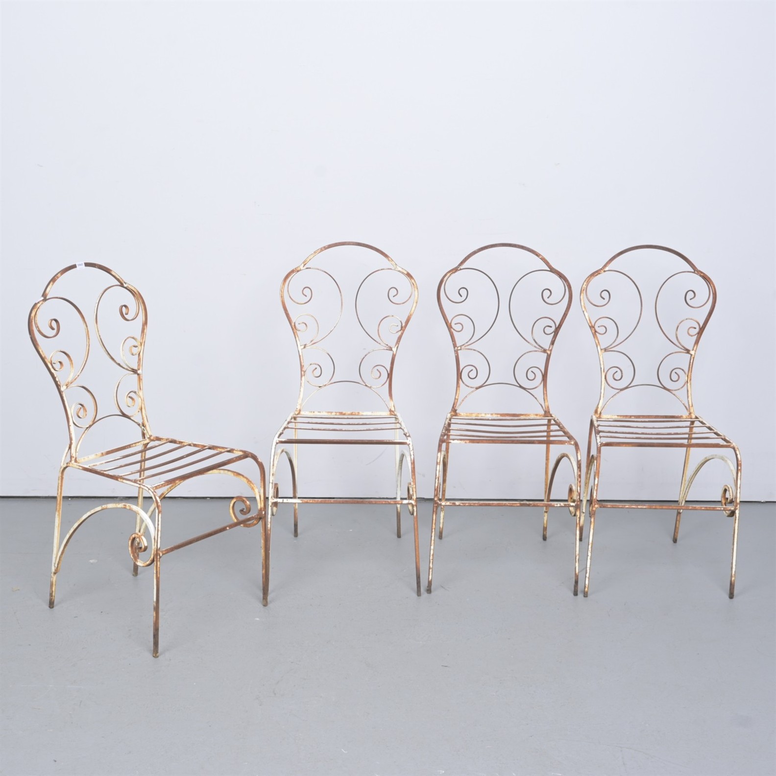 A SET OF FOUR FRENCH-STYLE WROUGHT IRON PATIO CHAIRS (A/F) (86H X 37W X 40D CM)