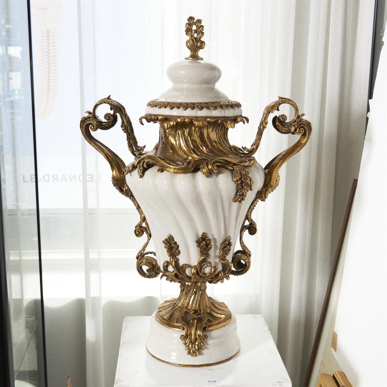 A LARGE, DECORATIVE ORMOLU MOUNTED CERAMIC URN (CHIPS TO INNER RIM UNDER COVER) H.73CM