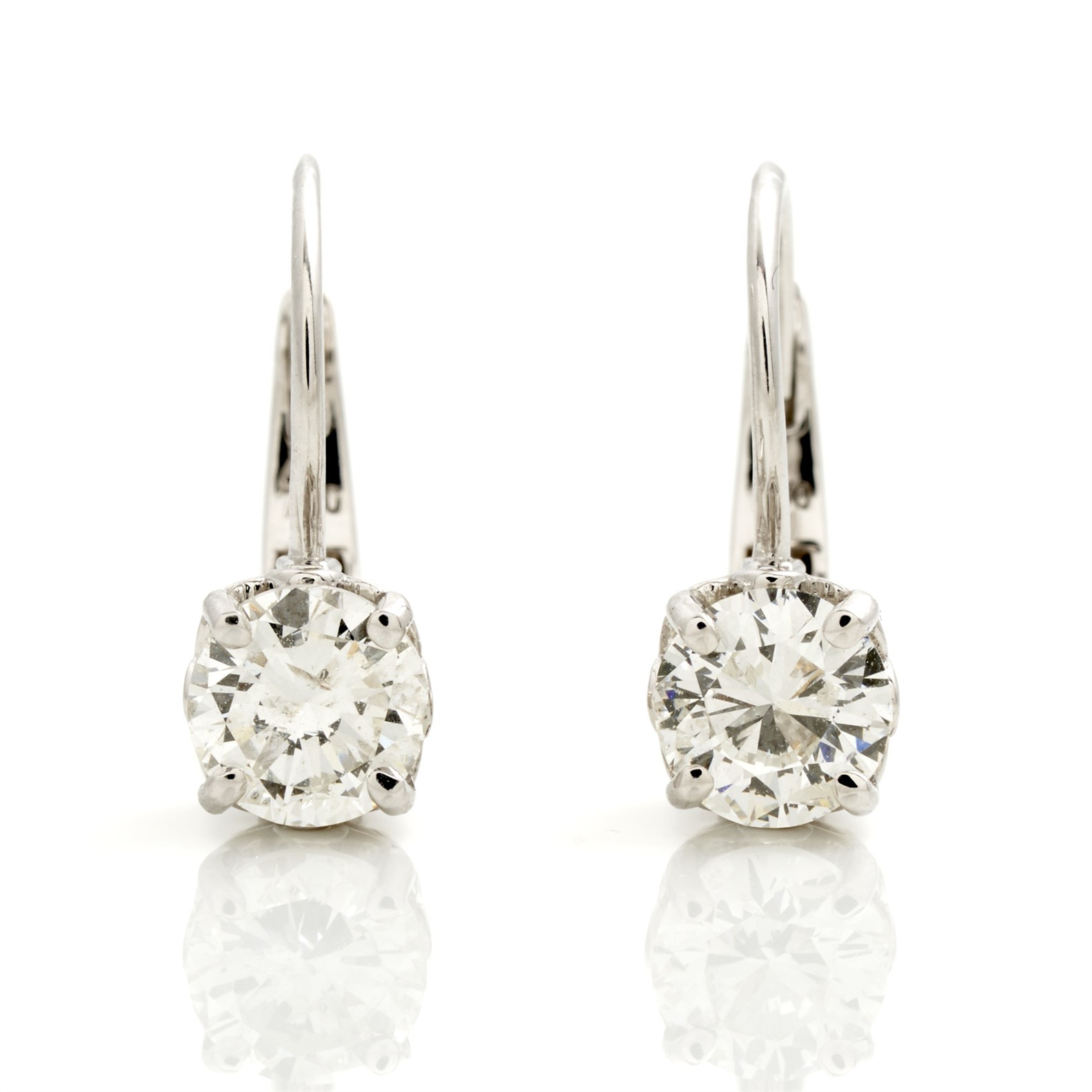 A PAIR OF DIAMOND EARRINGS TO POST AND HINGE FITTINGS IN 18CT WHITE GOLD, THE DIAMONDS TOTALLING 2.02CTS, H-I/S12-P1, 20MM, 4.0GMS, ACCOMPANIED BY A VALUATION AND CGL CERTIFICATE