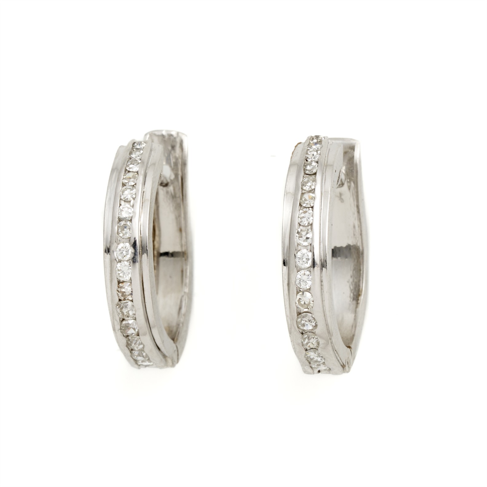 A PAIR OF DIAMOND EARRINGS TO POST AND HINGE FITTINGS IN PLATINUM, DIAMONDS TOTALLING APPROXIMATELY 0.50CTS, 20MM, 8.5GMS