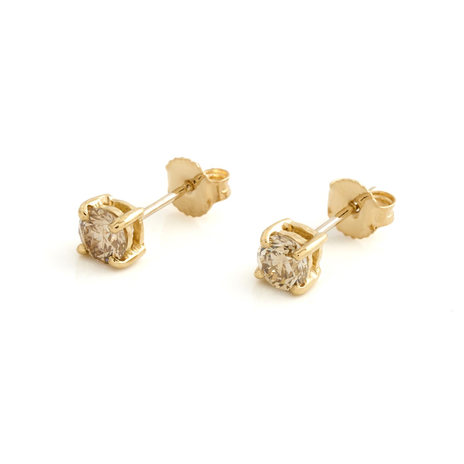 A PAIR OF FANCY LIGHT YELLOW BROWN DIAMOND EARRINGS IN 18CT GOLD, DIAMONDS TOTALLING 0.94CTS, TO POST AND BUTTERFLY FITTINGS, 1.3GMS