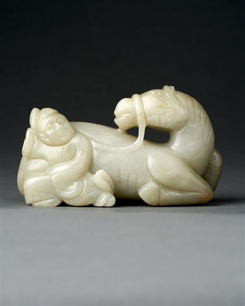 Jade carvings of foreign figures are extremely rare, with most known examples dating from the Tang to Ming dynasties. For comparable figures, see Christie¡¯s New York, 13 September 2018, lot 903, and Sotheby¡¯s London, 8 December 2022, lot 249. For a related jade group depicting a horse and groom, see Christie¡¯s Hong Kong, 30 May 2024, lot 2987. A jade horse carved in a similar pose was sold at Bonhams London, 11 November 2010, lot 26.