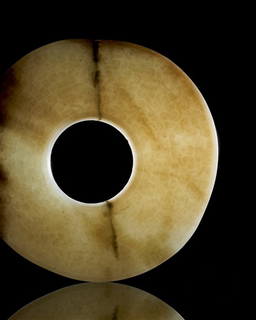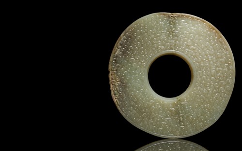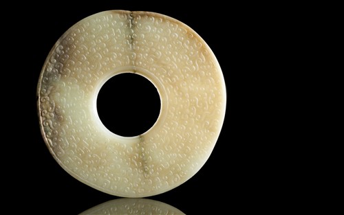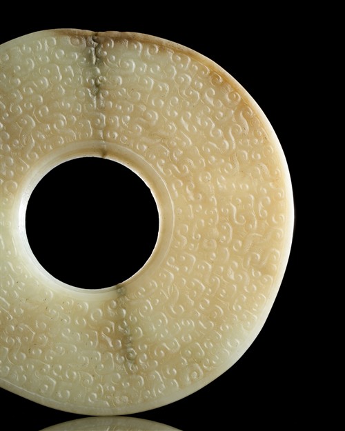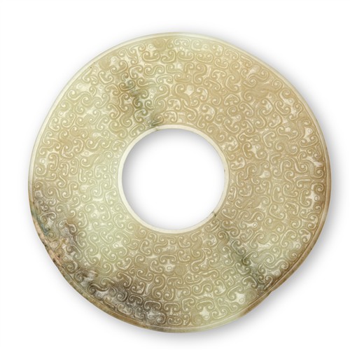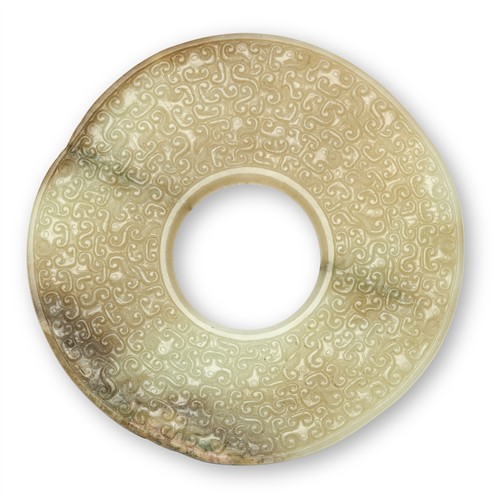 Both sides of the disc are finely carved in low relief with interlock dragons. With a fitted box. Similar interlocking dragon motifs are commonly seen on bronze vessels from the Spring and Autumn period. Comparable jade bi disc, see Christie's Hong Kong, 3 Dec 2021, lot 2724.