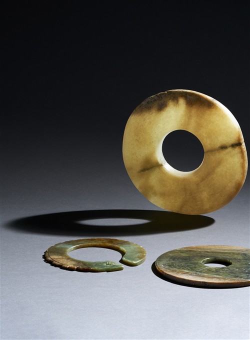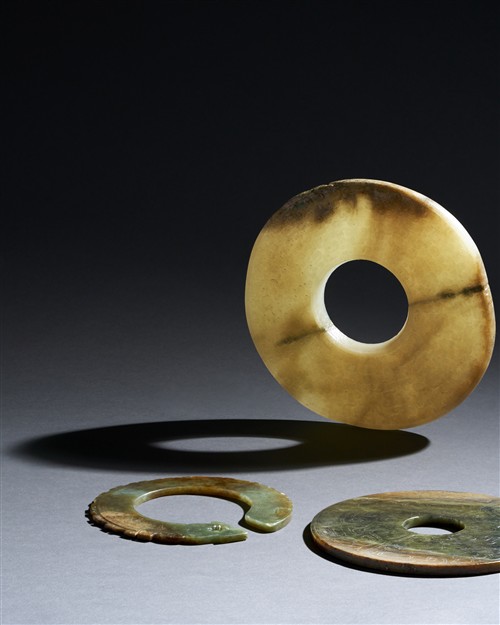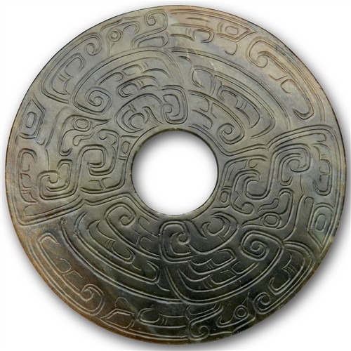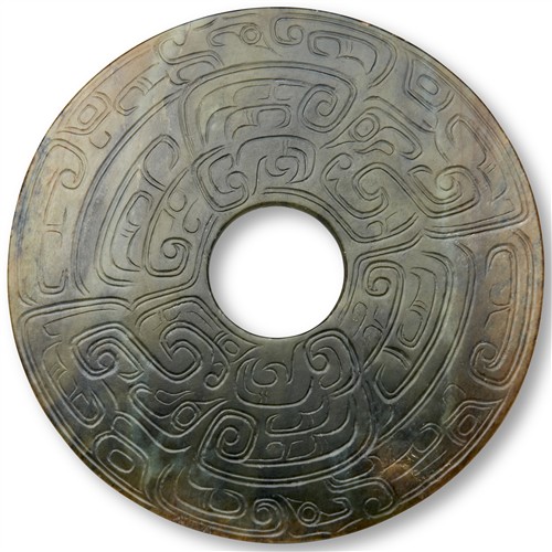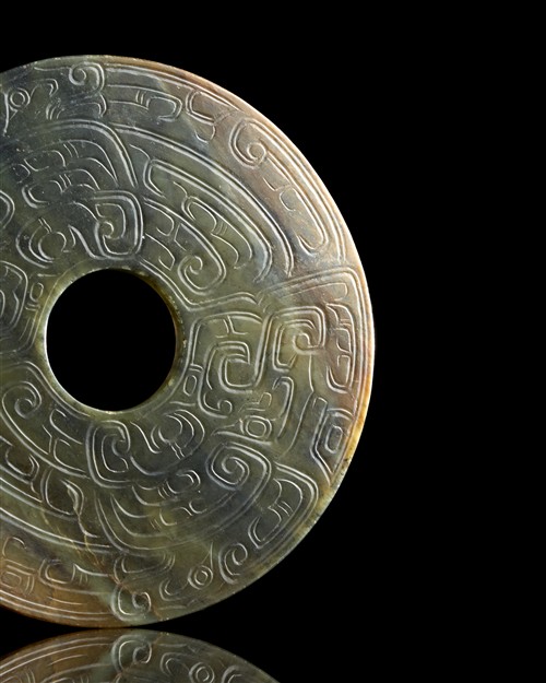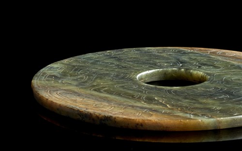 A CHINESE CELADON JADE "DRAGON" DISC, BI, MID-WESTERN ZHOU DYNASTY, CIRCA MID-10TH-MID-9TH-CENTURY BC