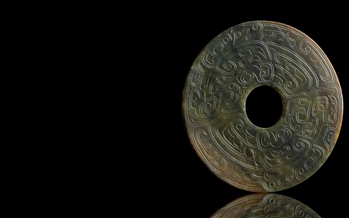 The jade disc is carved on both sides with profiles of dragon heads and joined by scroll motifs. The contours and details are rendered with double-line grooves. It's with a fitted box.
