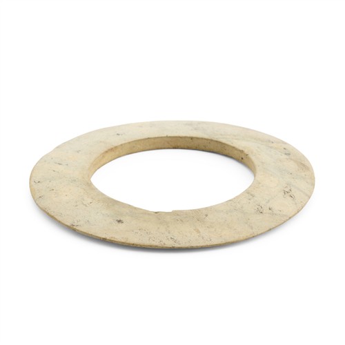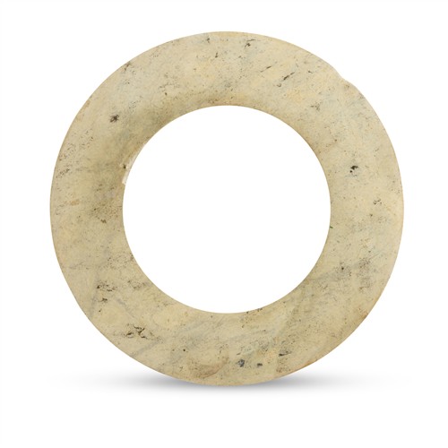 The disc carved with large central aperture with smooth wall, the sides gently rounded, the now-opaque stone of buff color marbled with fine green and russet markings.