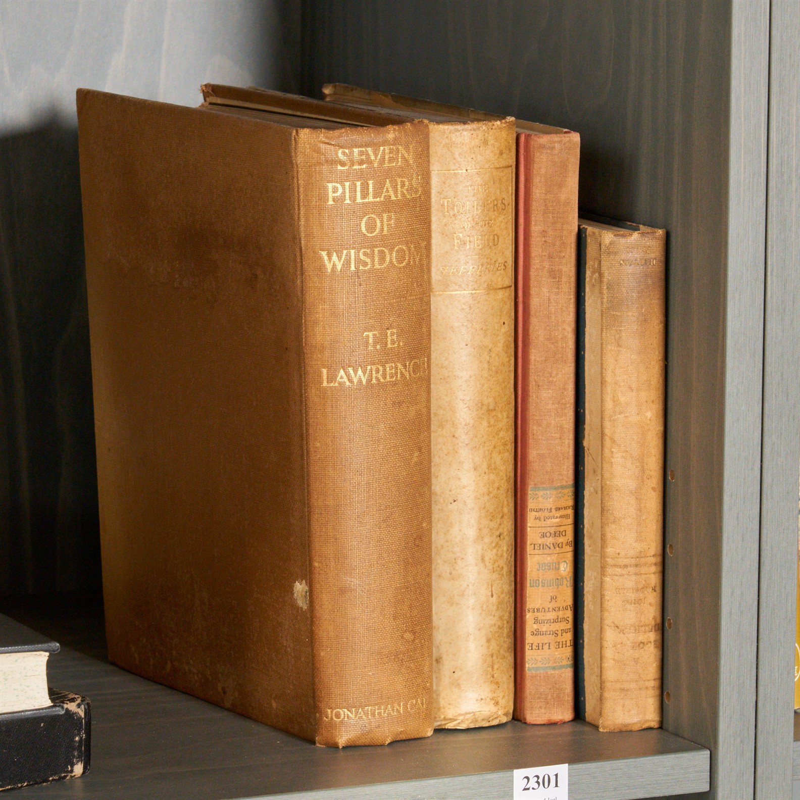 FOUR BOOKS: TOILERS OF THE FIELD, BY RICHARD JEFFERIES, LIMITED EDITION NO. 57/105, 1892, SEVEN PILLARS OF WISDOM BY T.E. LAWRENCE, FIFTH IMPRESSION, 1935, THE LIFE AND STRANGE SURPRISING ADVENTURES OF ROBINSON CRUSOE, AND THE BOOK OF DELIGHTS