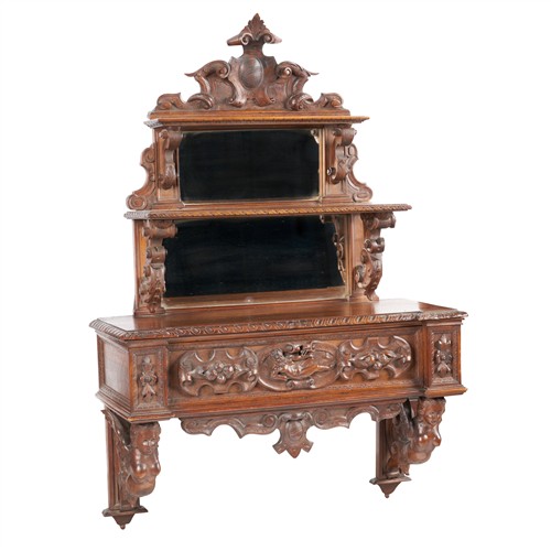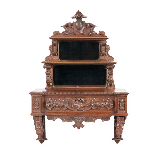 In Flemish Renaissance manner, the shaped crest above a cascading front of mirror-backed shelves and a drawer below, carved throughout with Classical figures and motifs including the lower brackets as a pair of winged female figures