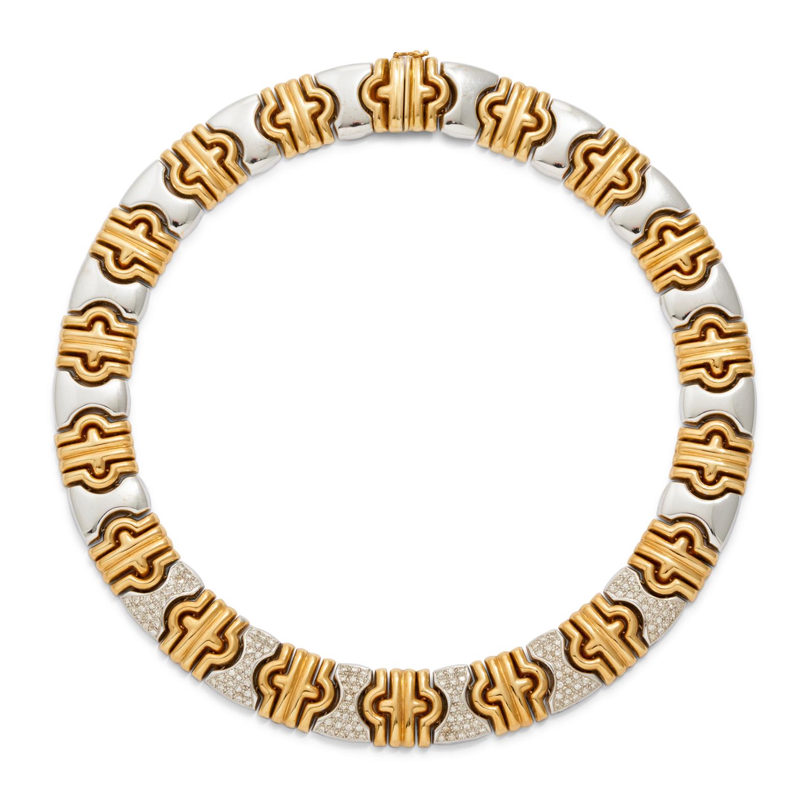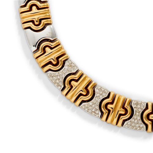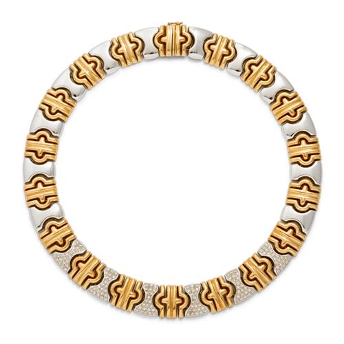 Of geometric design composed of a series of 'parentesi' links, the front pavé-set at intervals with brilliant-cut diamonds, the diamonds together weighing approximately 2.00 carats, gross weight approximately 127.7 grams, inner circumference 400mm, width 18mm, marked 18K Italy.