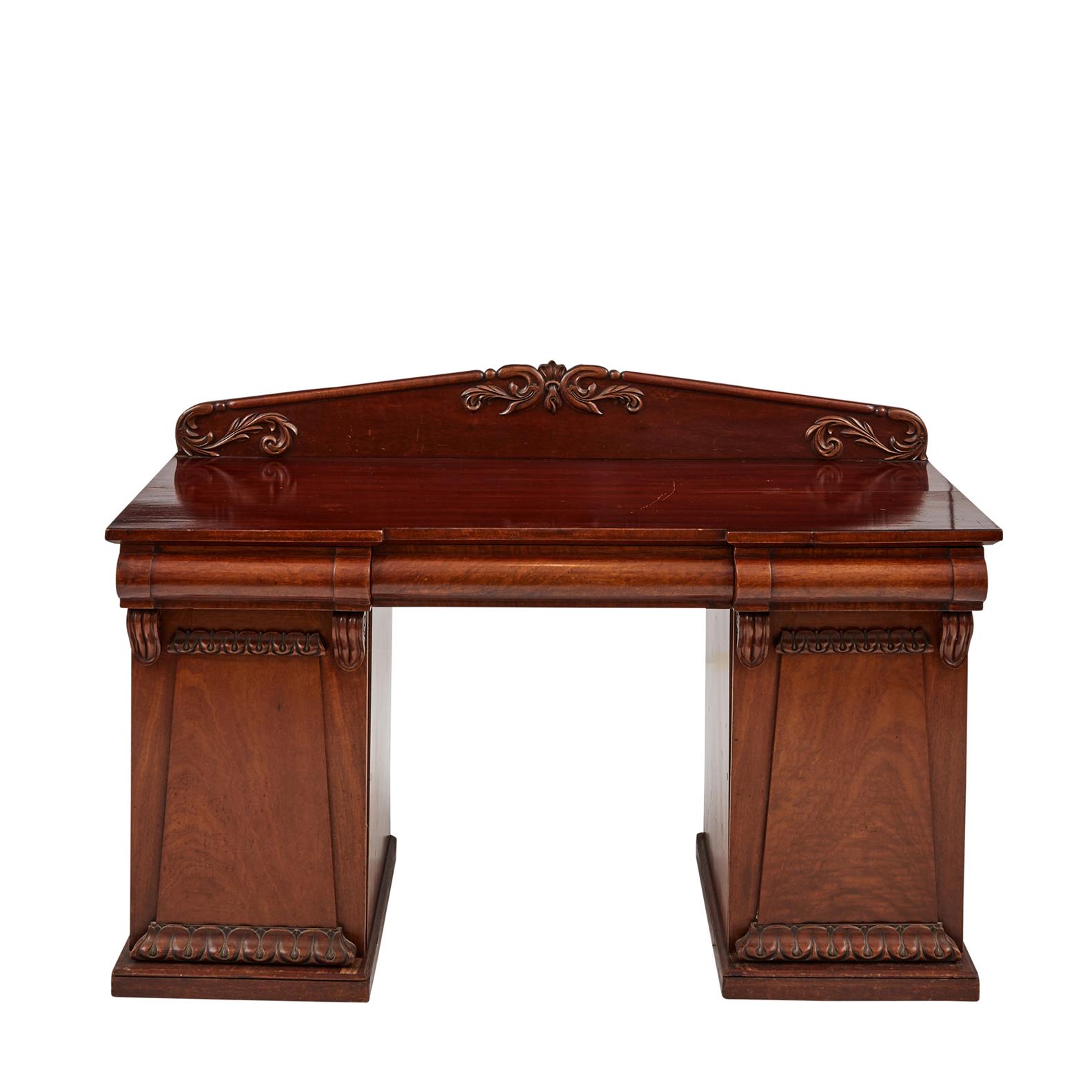 The raised back with carved leaf scrolls above an inverted breakfront with three bolection moulded drawers on pedestals with cupboards having carved scrolls and tapering plinth panels with well-carved lotus mouldings, on a plinth base.