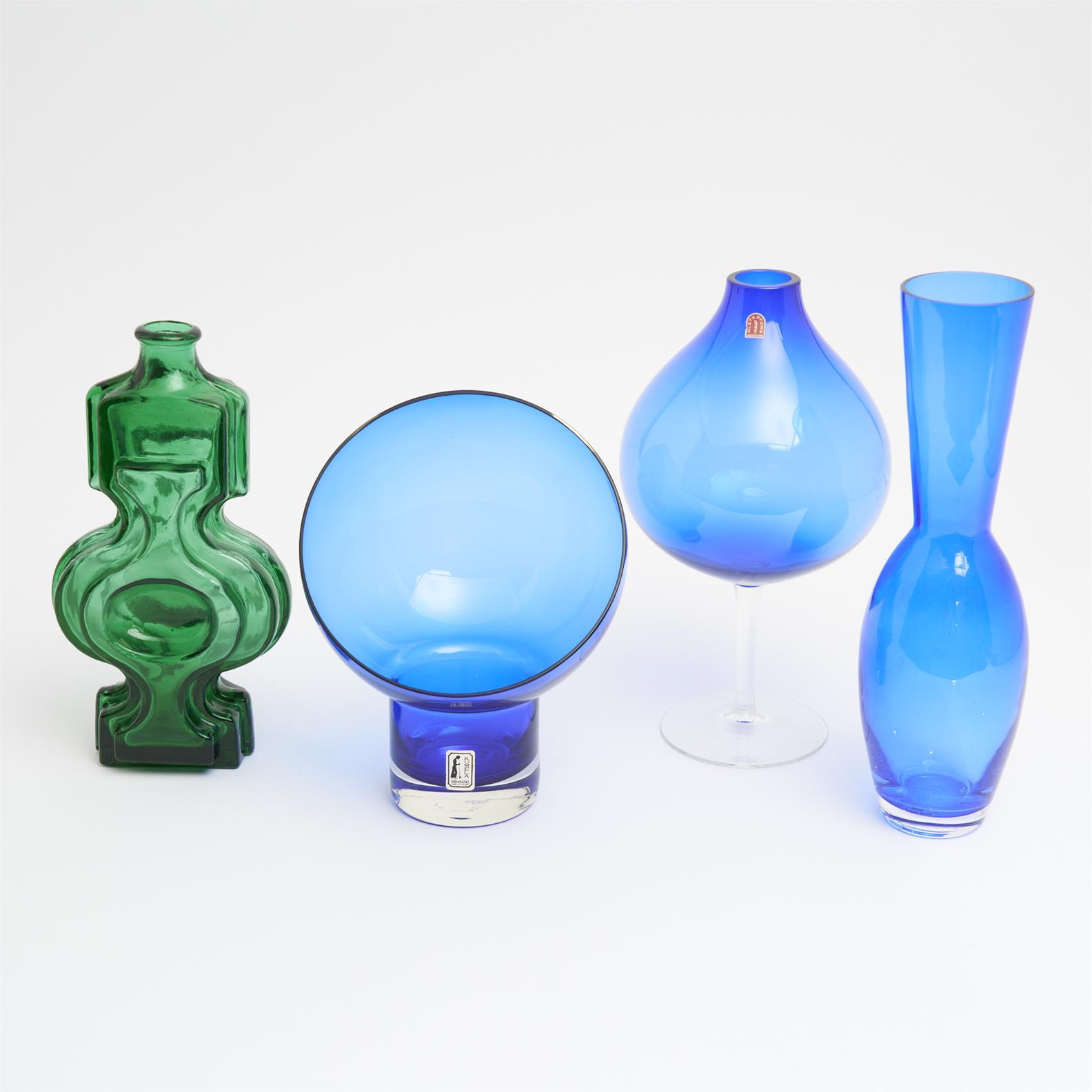 A SCANDINAVIAN BLUE GOBLET VASE BY ALSTERFORS SWEDEN TOGETHER WITH A SWEDISH 'SKITTLE' VASE, A RIIHIMAKI VASE WITH 45 DEGREE RIM AND AN 'EMMA' BOTTLE VASE DESIGNED BY HELENA TYNELL H.30CM (TALLEST)