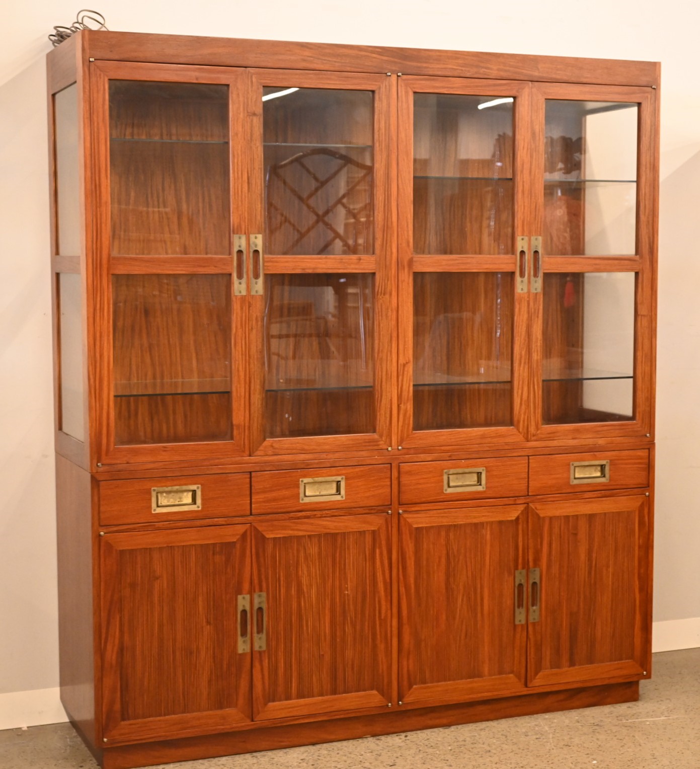 A HARDWOOD AND GLAZED DISPLAY CABINET (184H X 165W X 46D CM) (THIS ITEM HAS TO BE REMOVED BY CARRIERS AT THE CUSTOMER'S EXPENSE. LEONARD JOEL STAFF WILL NOT ASSIST CARRYING THIS ITEM)