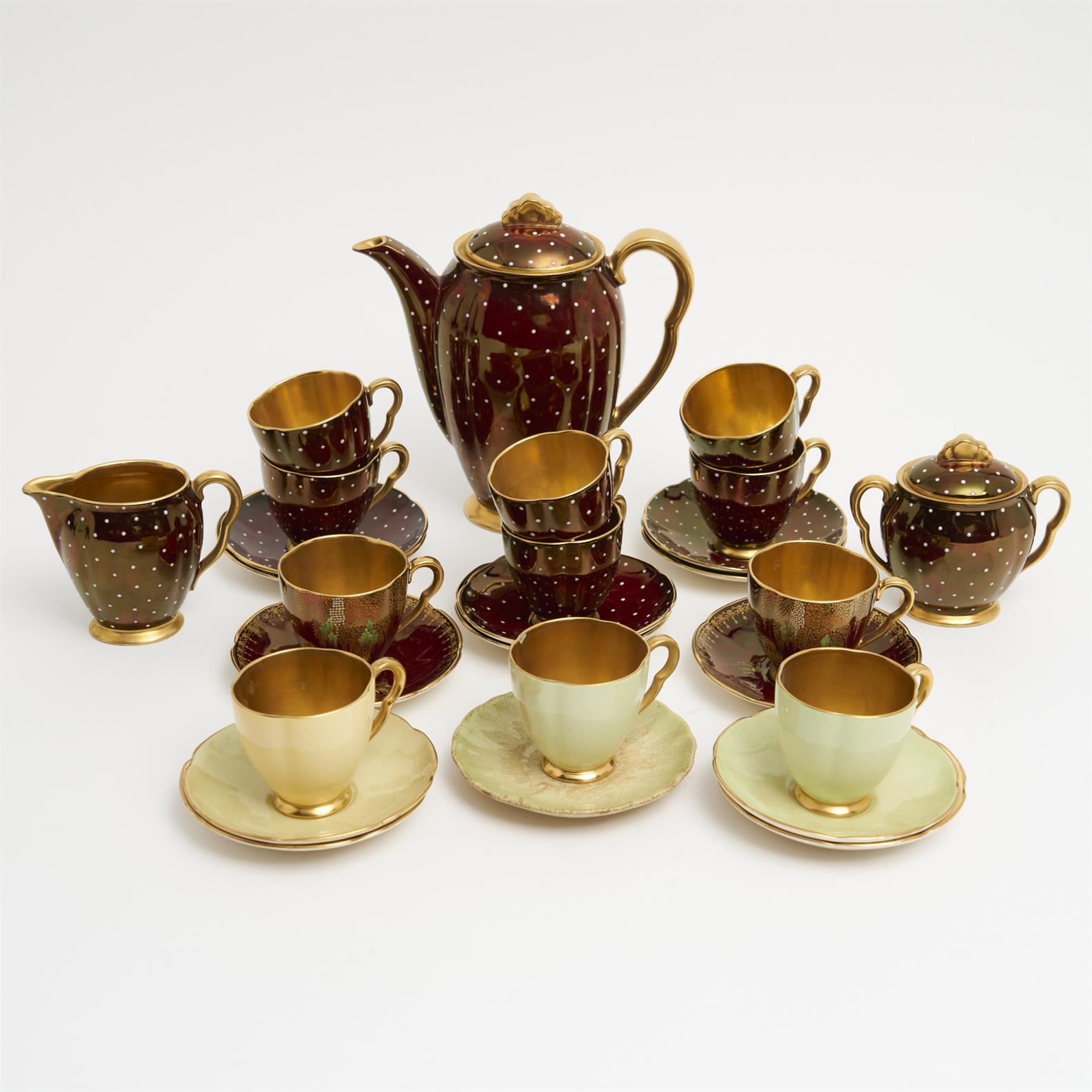A CARLTONWARE ROUGE ROYALE POLKA DOT PART COFFEE SERVICE TOGETHER WITH ADDITIONAL MATCHING CARLTONWARE COFFEE CUPS AND SAUCERS (A/F) H.20CM (TALLEST)