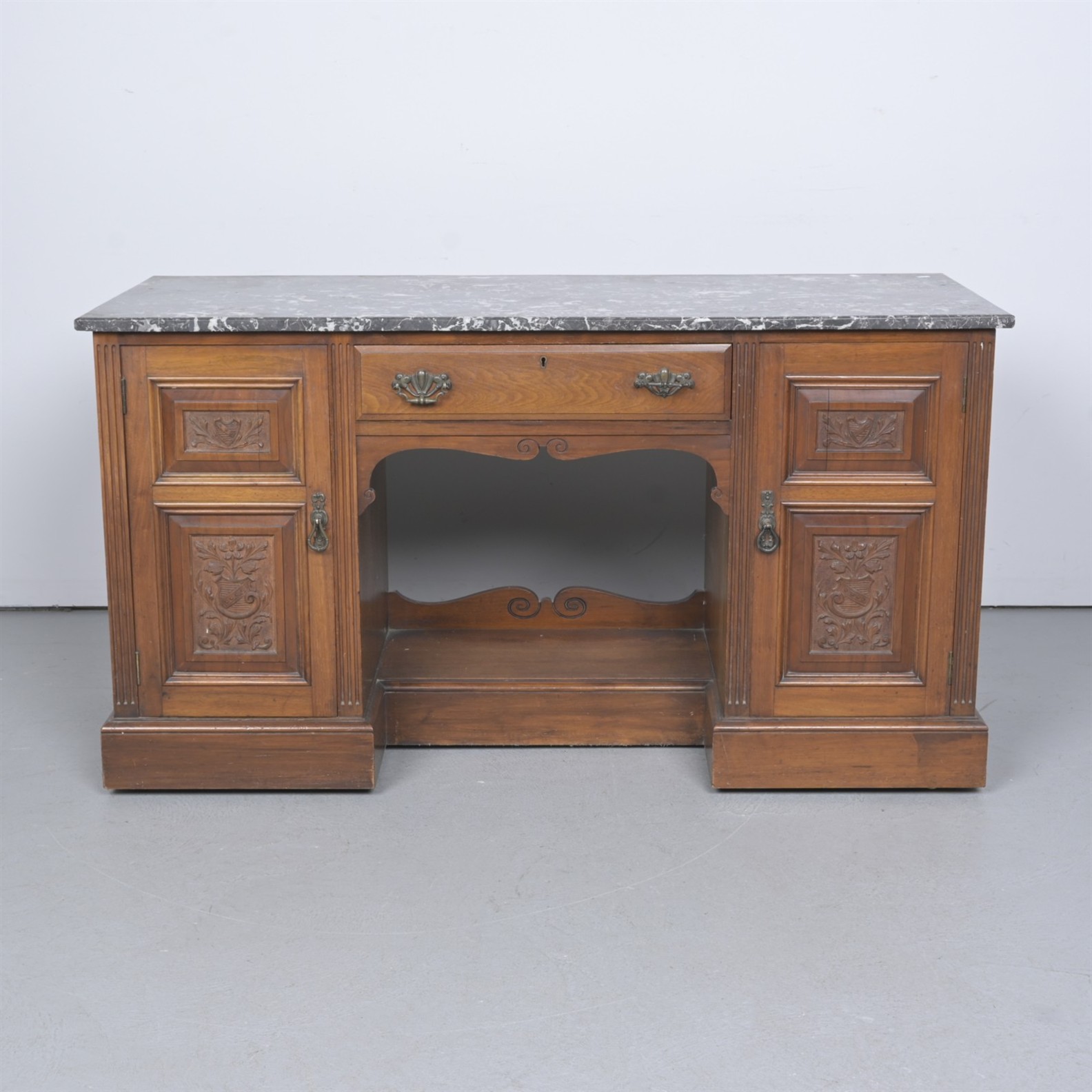 A VICTORIAN KNEEHOLE DESK WITH MARBLE TOP (75H X 138W X 56D CM)(THIS ITEM MUST BE REMOVED BY CARRIERS AT THE CUSTOMER'S EXPENSE. LEONARD JOEL STAFF CANNOT ASSIST CARRYING THIS ITEM)